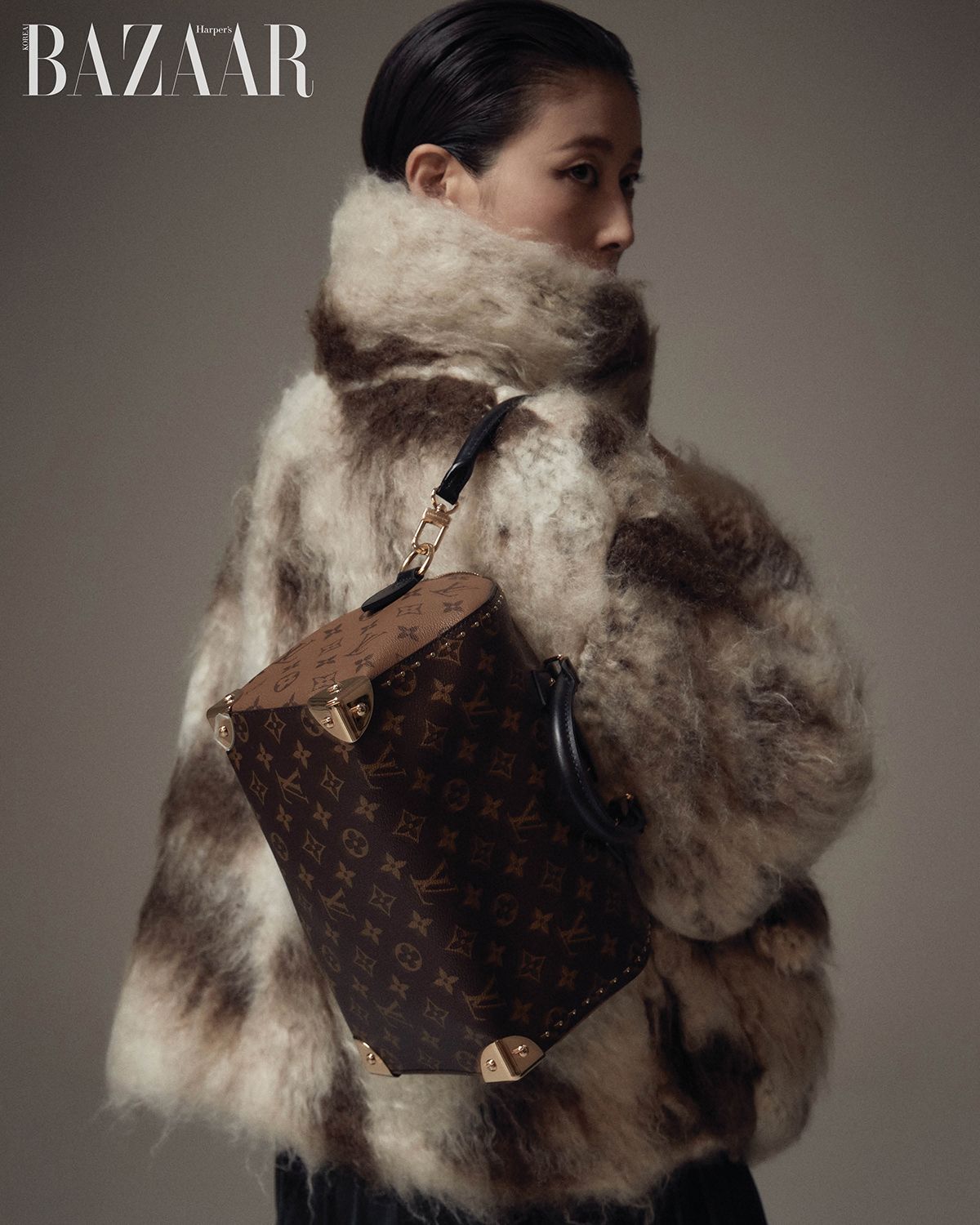 퍼 재킷은 Celine. 롱 드레스, ‘스피디 트렁크 25’ 백은 Louis Vuitton.