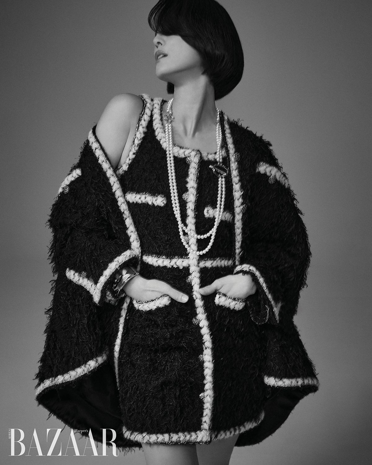 트위드 케이프·드레스 세트업, 목걸이, 뱅글은 모두 Chanel.