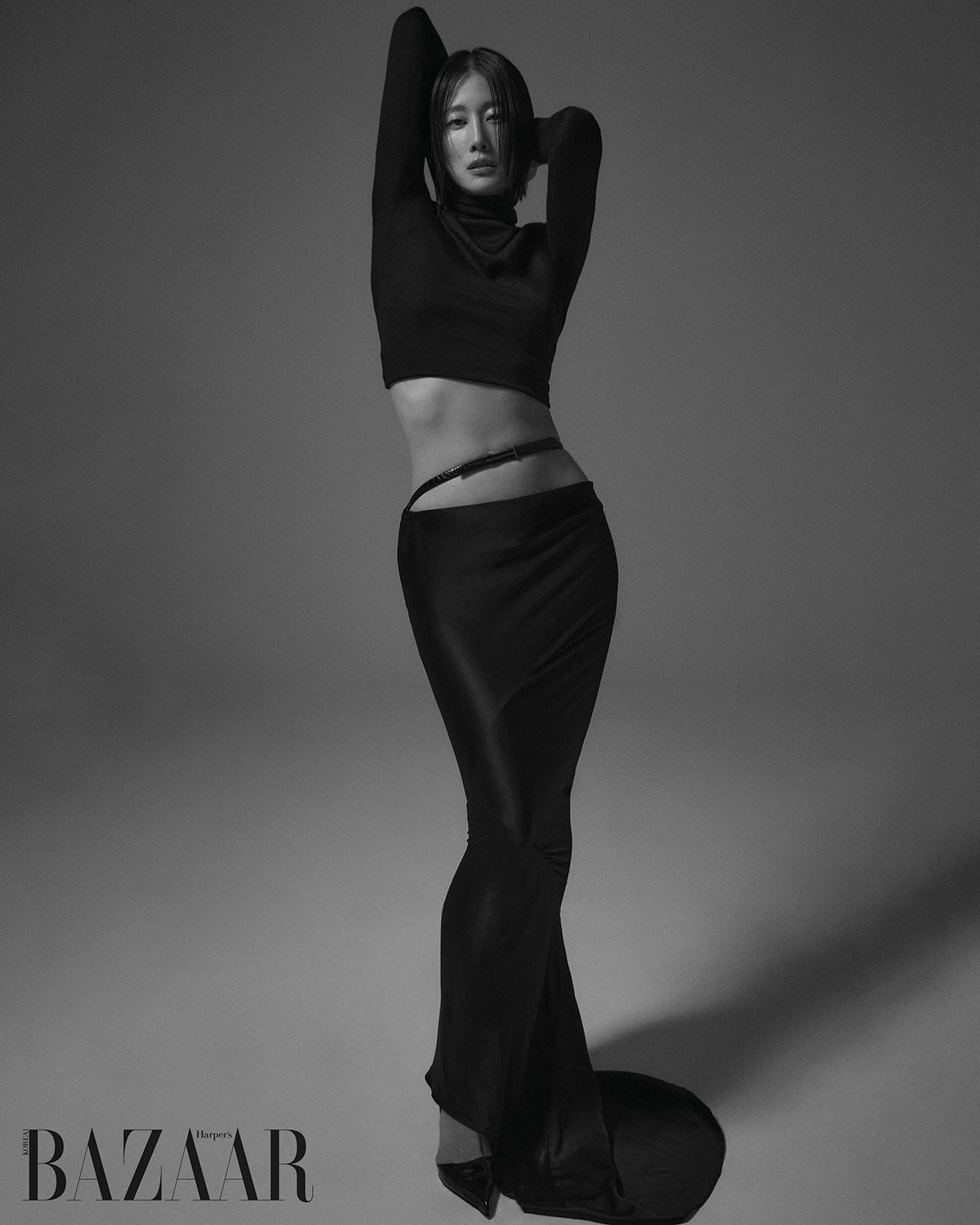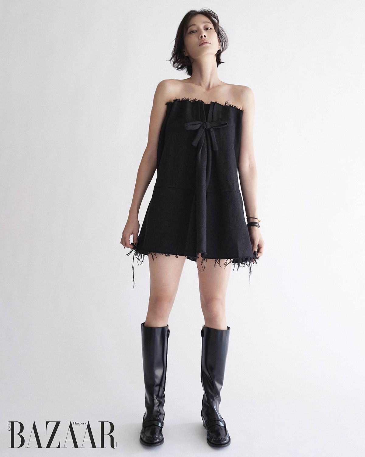튜브톱 드레스, 부츠는 Prada. 카프스킨 소재 팔찌, 레이어드한 팔찌는 Hermès.