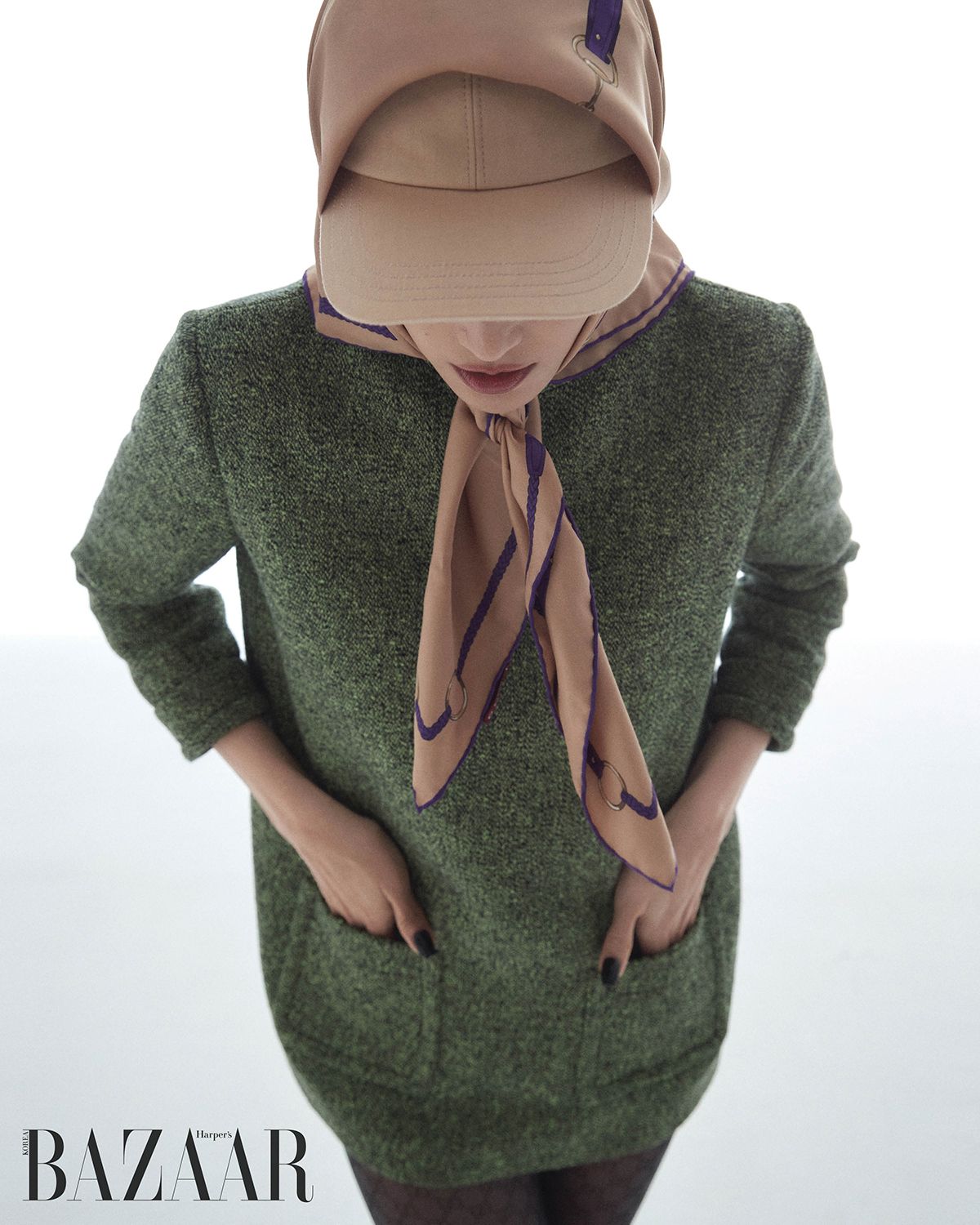 미니 드레스, 캡, 스카프, 타이츠는 모두 Gucci.