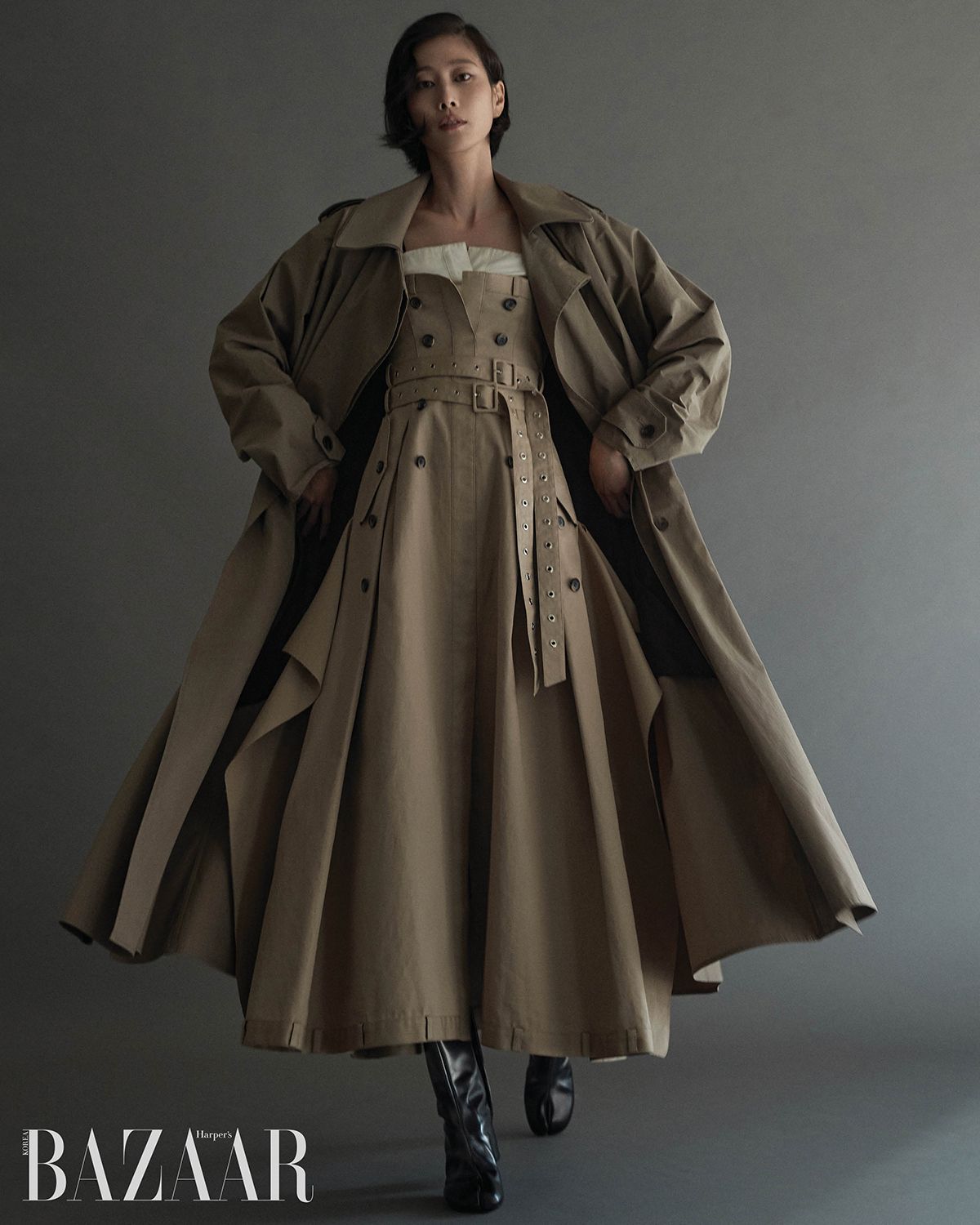 트렌치코트는 Gia Studios by 10 Corso Como Seoul. 튜브톱 드레스는 Rokh. 앵클부츠는 Masion Margiela.