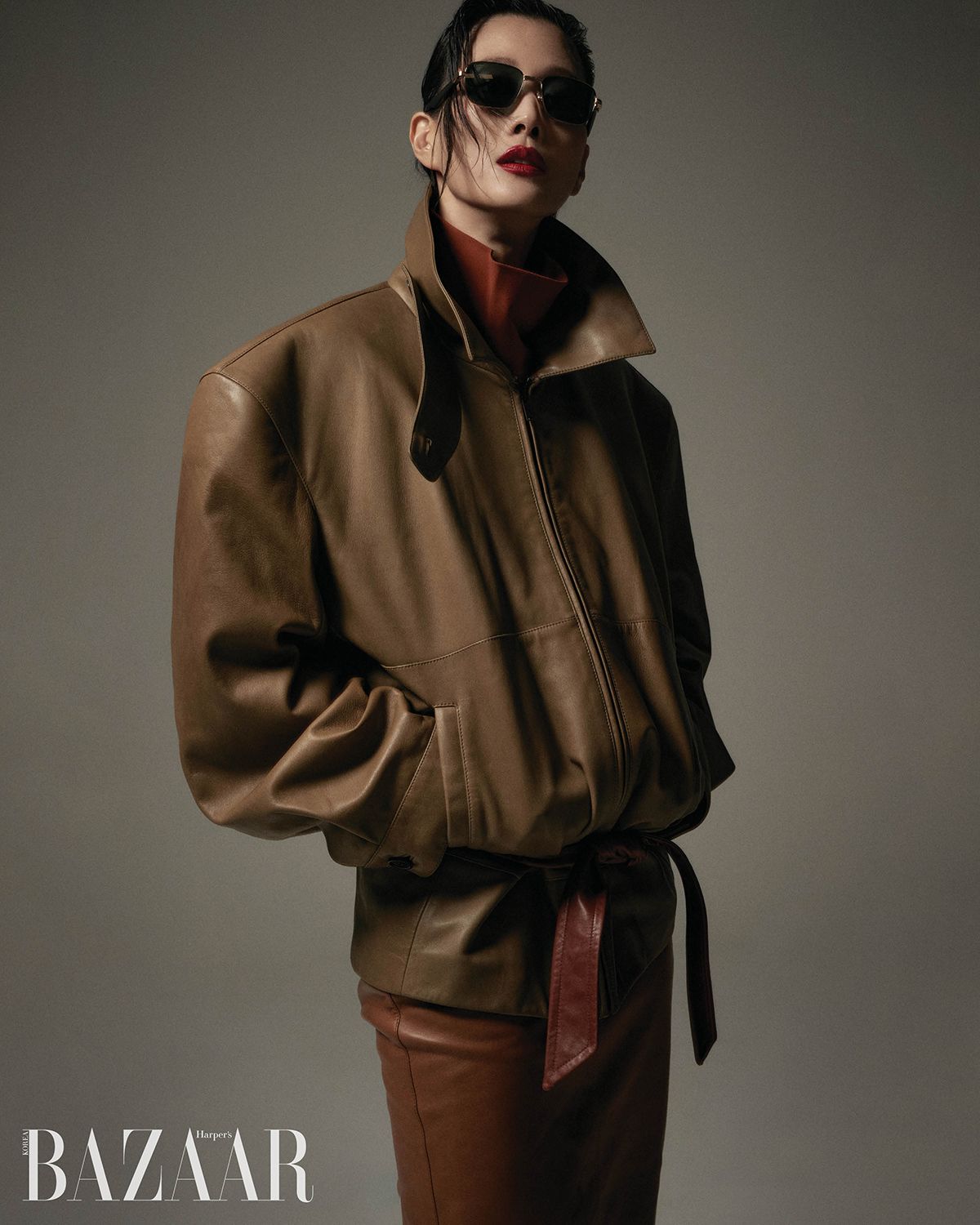벨티드 레더 재킷, 하이넥 블라우스, 스커트는 모두 Saint Laurent by Anthony Vaccarello. 선글라스는 Cartier.