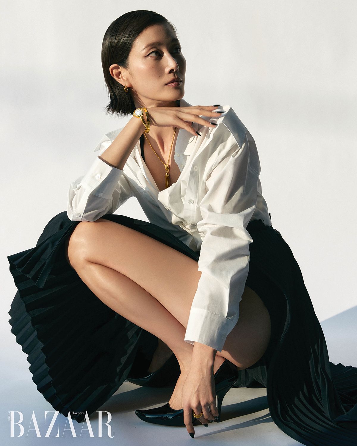 셔츠는 Eenk. 보디수트, 스커트는 Michael Kors Collection. 귀고리, 태슬 디테일 목걸이, ‘베누아’ 워치, 레이어드한 팔찌는 가격 미정, 다이아몬드를 세팅한 반지는 9백만원대, 레이어드한 반지는 4백만원대 모두 Cartier. 펌프스 힐은 Masion Margiela.