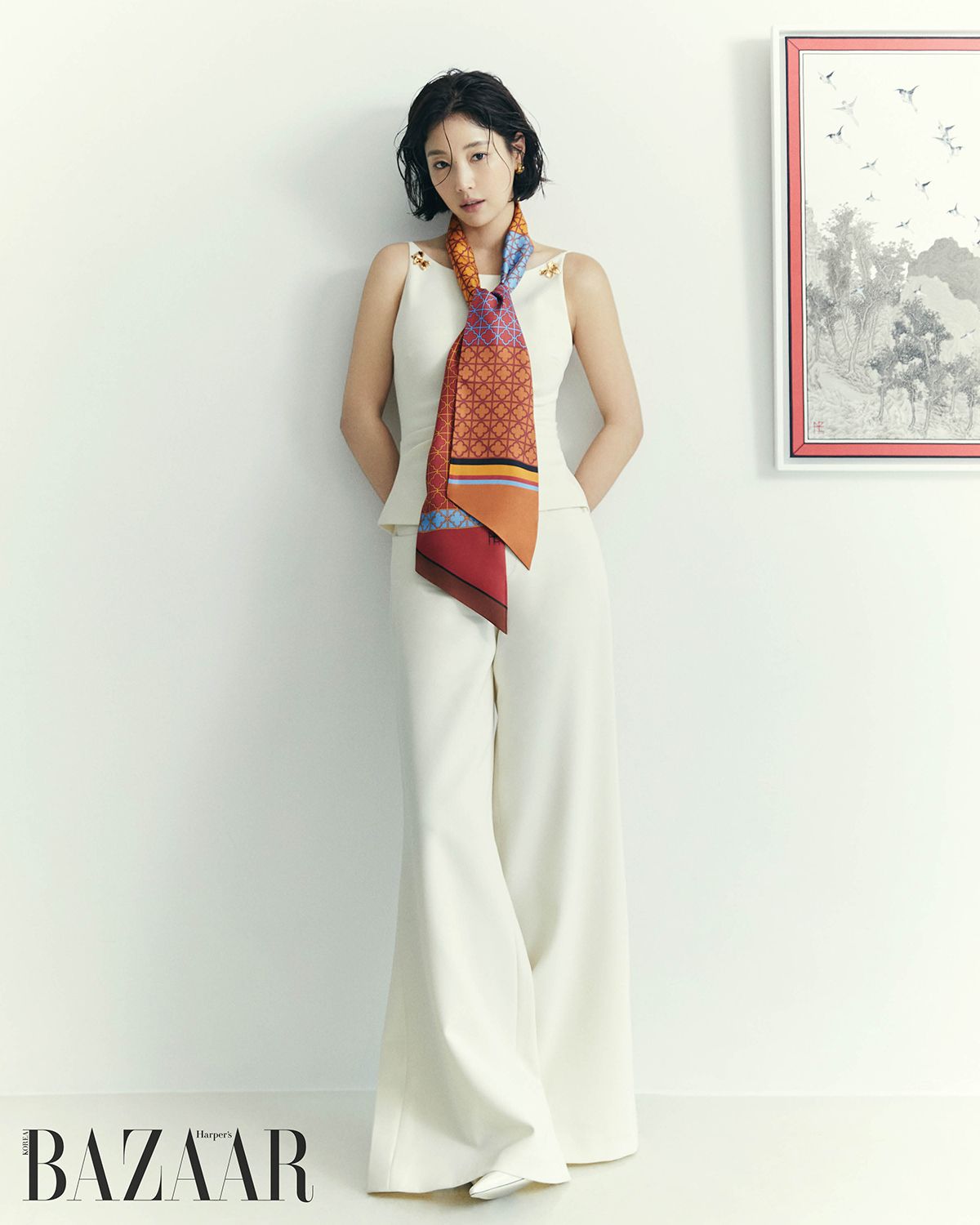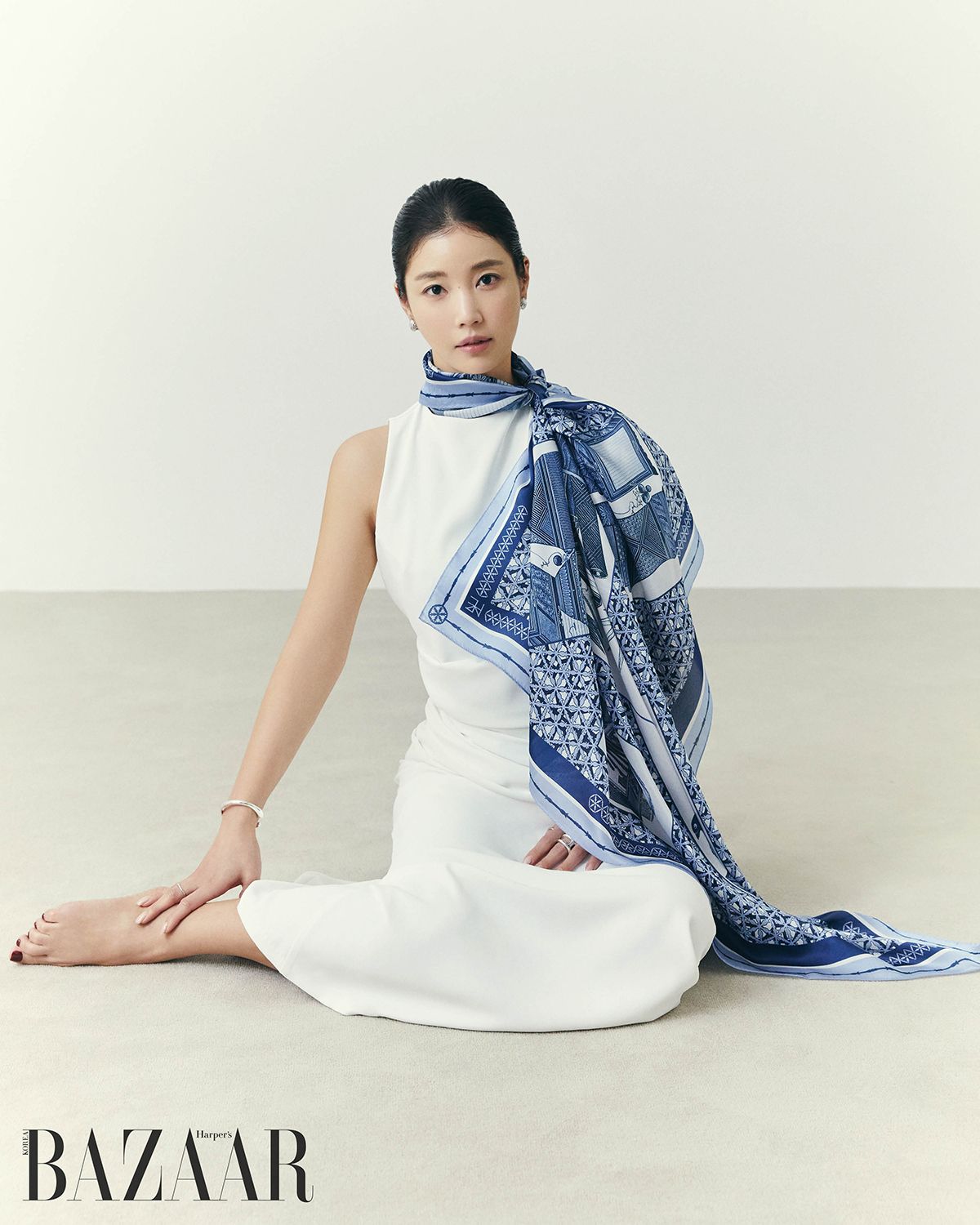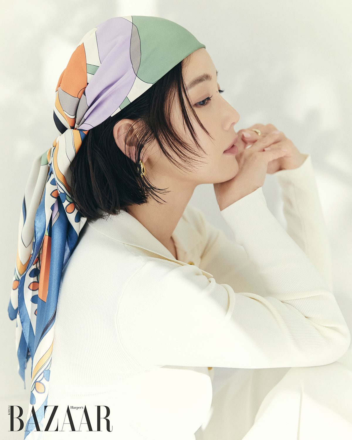 머리에 두른 실크 트윌 소재의 ‘도자기’ 스퀘어 스카프는 25만원 HYE.