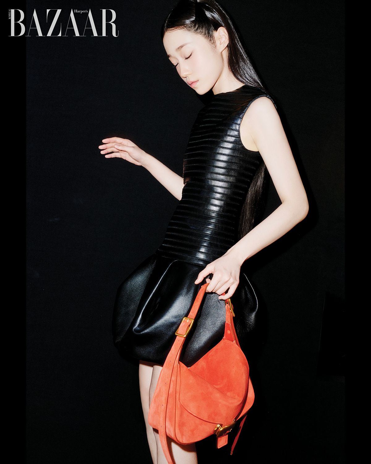 블랙 레더 소재 벌룬 디테일의 발렌시아가 미니 드레스를 입은 노윤서가 뉴 시즌 백을 들고 포즈를 취하는 순간.