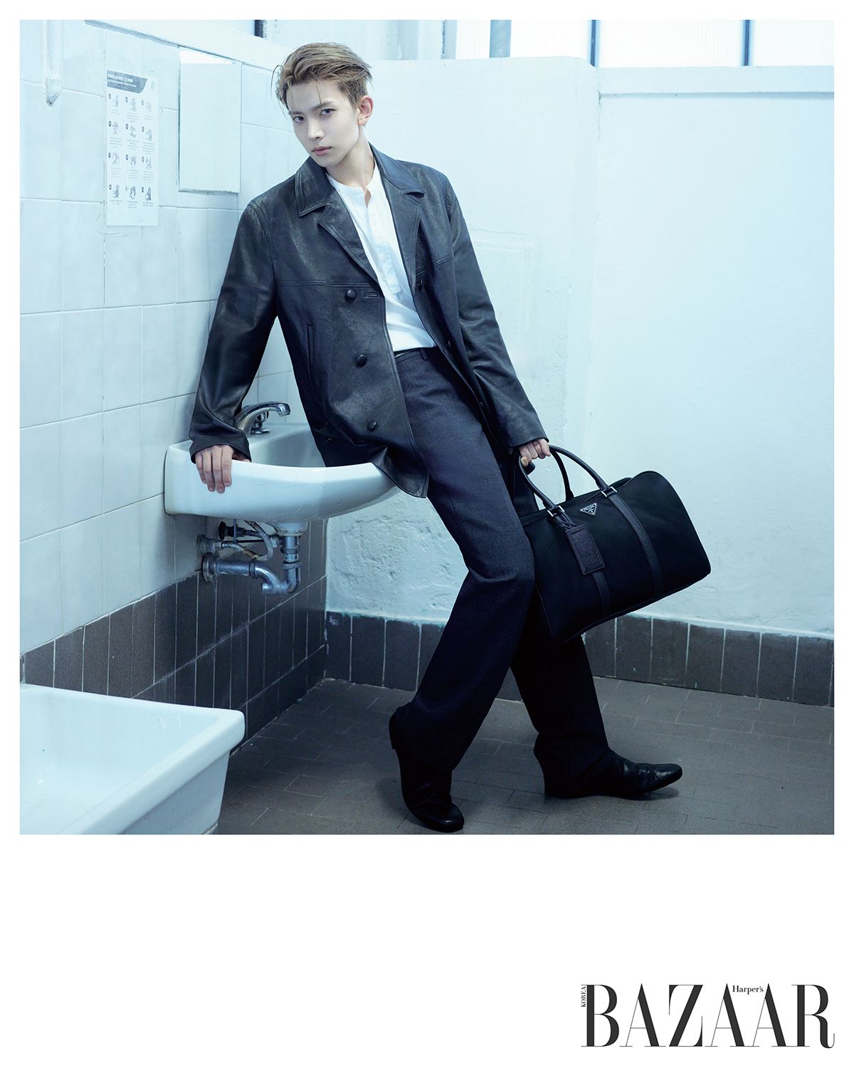 나파 레더 재킷, 셔츠, 팬츠, 벨트, ‘리나일론’ 트래블 백, 부츠는 모두 Prada.