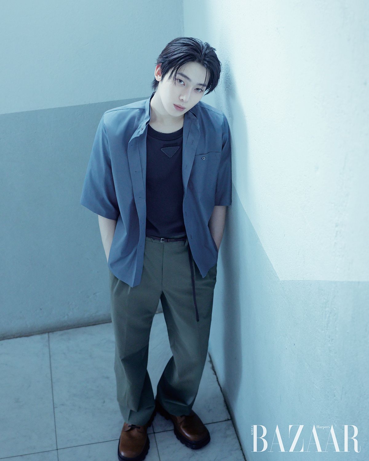 포플린 셔츠, 저지 톱, 팬츠, 벨트, 슈즈는 모두 Prada.