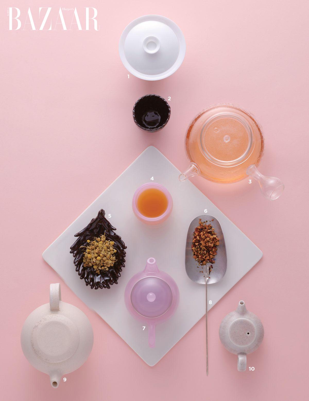 1, 3, 4, 7 가장자리가 얇고 가벼워 한 손으로 따르기 편한 백태 개완, 찻잎이 우러나는 과정을 볼 수 있는 투명한 유리 티포트, 차의 적정 온도를 유지해주는 특수 유리 소재로 만든 분홍빛 찻잔, 티포트는 모두 가격 미정 Tove. 2, 5 작은 원형 점토를 쌓아 빚은 검은 찻잔은 6만2천원, 나뭇잎 모양의 검은 다하는 8만5천원 Eastsmoke. 6, 8 가장자리가 곡선 형태로 말린 다하는 4만원, 차에 곁들일 한 입 크기 디저트에 쓰기 좋은 티 포크는 14만원 Foh. 9 매트한 질감과 뚜껑 손잡이를 없앤 미니멀한 디자인이 특징인 다관은 가격 미정 Herere. 10 1인 찻자리에 알맞은 75ml 용량의 미니 다관은 13만원 Nalbit.