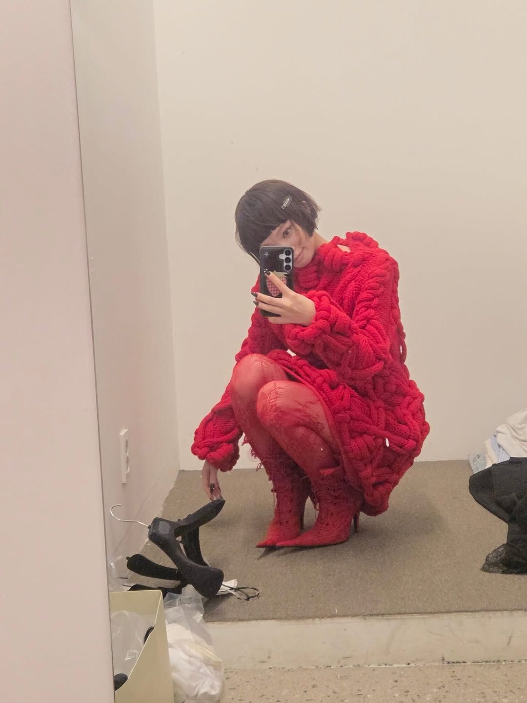 수사샤의 걸리시하면서도 개성있는 레드 니트 스타일링