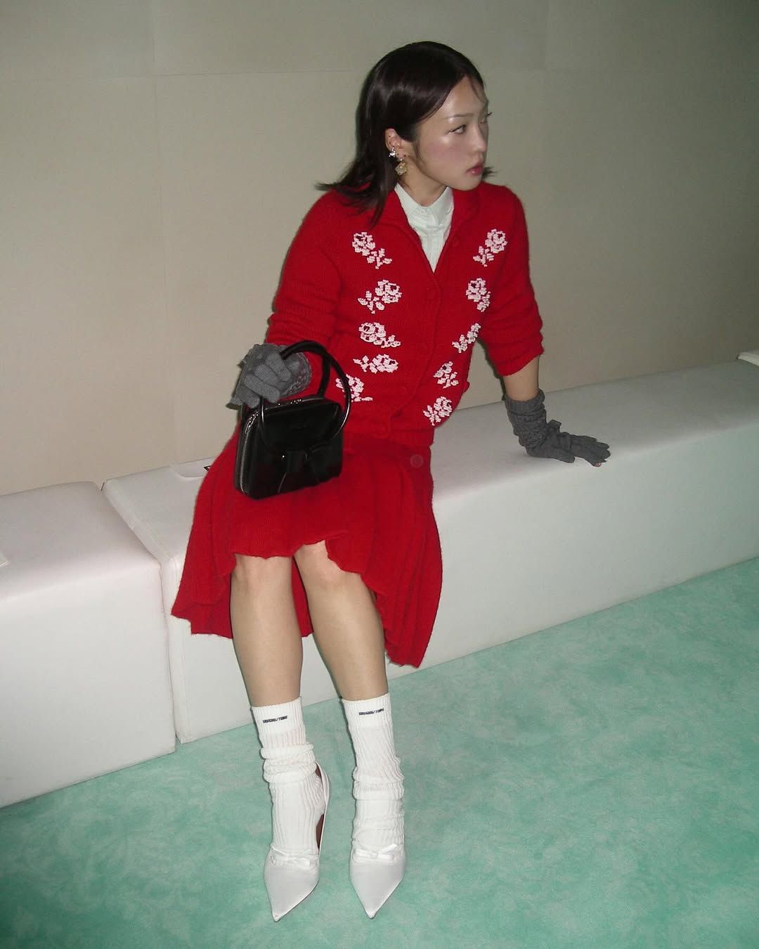 슈슈통의 레드 니트 원피스와 같은 재질의 스커트를 선택한 수샤샤의 스타일링은 한 눈에 시선을 끄는 레드의 주목성을 살리면서도 쿨하게 연출하는 법을 알려주는 듯하다. 화이트 플라워 패턴이 들어간 니트 가디건의 이너로 납작한 카라의 셔츠를 매치하고 화이트 삭스와 새틴 슈즈를 선택해 소녀미를 강조했다. 장식미가 돋보이는 귀엽고 볼드한 액세서리도 빼놓을 수 없는 포인트 이지만, 레드와 선명한 컬러 대비를 이루는 미니 블랙백과 롱 니트 글러브의 조합이 스타일링의 방점을 찍었다. 이 중 두 가지 포인트만 따라해도 레드 드레스 스타일링에 실패는 없을 예정이다.