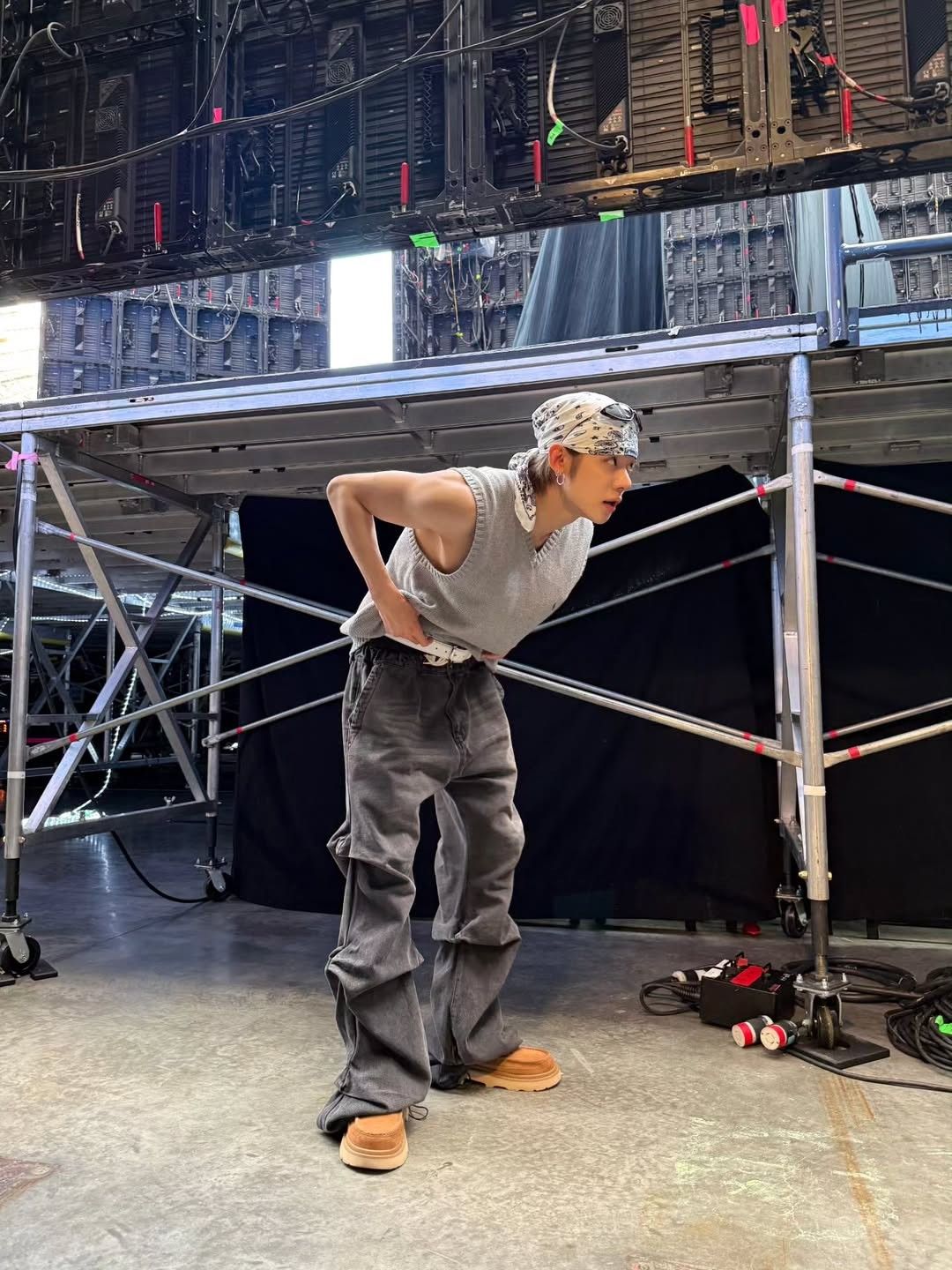 월드투어 리허설 현장에서는 캐주얼한 아이템에 과하지 않게 힙한 무드를 더한 패션 센스가 돋보였다. 폴로 랄프 로렌의 그레이 니트 베스트와 스트링 디테일이 특징인 NOT4NERD의 와이드 데님 팬츠를 매치했다. 여기에 반다나로 마무리하고, 이번에도 어김없이 어그의 애스콧 러그 슈즈를 선택하며 자신만의 시그니처 스타일을 완성했다.