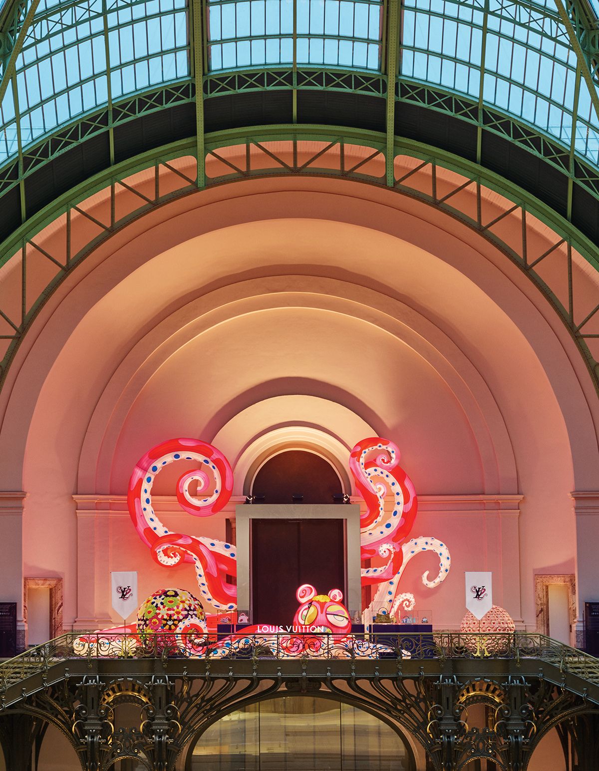 아트 바젤 파리 2025가 열리는 그랑 팔레에 입성하면 가장 먼저 시선이 향하는 장소, 발콩 도노르. 각각의 부스를 내려다보는 그야말로 모든 미술 현장의 중심이며, 3년 연속 아트 바젤 파리 2025(Art Basel Paris 2025)의 공식 협력 파트너로 참여하는 루이 비통이 ‘아티카퓌신 VII‐루이 비통×무라카미 다카시’ 컬렉션을 선보이는 곳이다. 작년엔 프랭크 게리의 물고기가 주인공이었다면, 올해는 무라카미 다카시의 거대한 문어 조각상이 전시 공간 전체를 뒤덮었다.