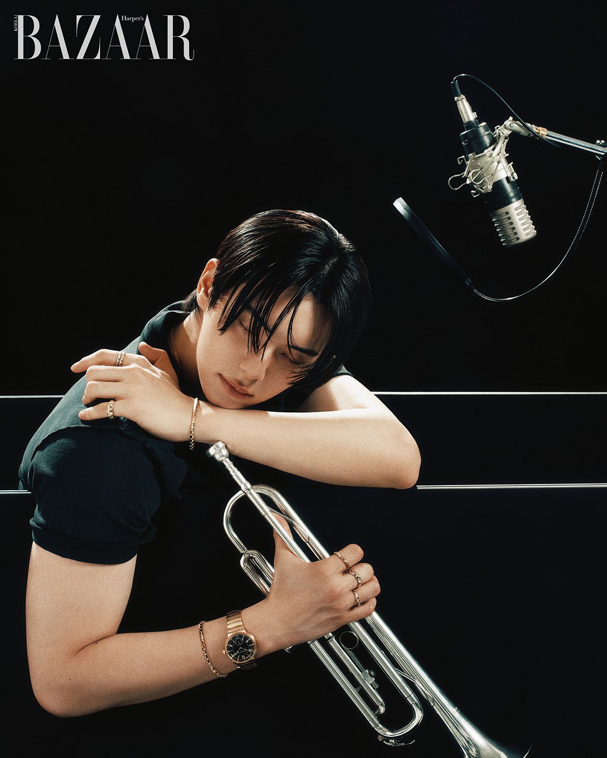 왼팔에 착용한 ‘땅부르’ 워치, 왼손 검지에 착용한 스몰 사이즈 핑크 골드 링, 레이어드한 스몰 사이즈 옐로 골드 링, 소지에 착용한 미디엄 사이즈 핑크 골드 링, 오른손 검지에 착용한 라지 사이즈 화이트 골드 링, 중지에 착용한 미디엄 사이즈 화이트 골드 링, 오른팔에 착용한 스몰 사이즈 핑크 골드 브레이슬릿, 레이어드한 미디엄 사이즈 화이트 골드 브레이슬릿은 모두 다이아몬드 세팅의 ‘르 다미에 드 루이 비통’ Louis Vuitton.