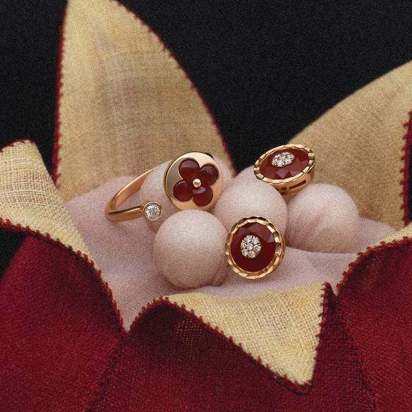 검지에 착용한 미디엄 사이즈 핑크 골드 링, 중지에 착용한 옐로 골드 링, 약지에 착용한 라지 사이즈 화이트 골드 링, 소지에 착용한 옐로 골드 링은 모두 다이아몬드 세팅의 ‘르 다미에 드 루이 비통’ 컬렉션 Louis Vuitton.