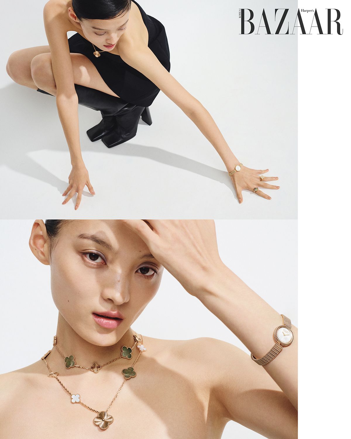 (아래) 다이아몬드를 파베 세팅한 ‘빈티지 알함브라 이어링’, 다양한 연출이 가능한 ‘매직 트랜스포머블 롱 네크리스’, 오른팔에 착용한 ‘스위트 알함브라 워치’, 오른손 검지에 착용한 ‘빈티지 알함브라 리버서블 링’, 왼손 중지에 착용한 ‘빈티지 알함브라 링’, 왼팔에 착용한 ‘뻬를리 시그너처 브레이슬릿’, 레이어드한 ‘뻬를리 스위트 클로버 브레이슬릿’은 모두 Van Cleef & Arpels.