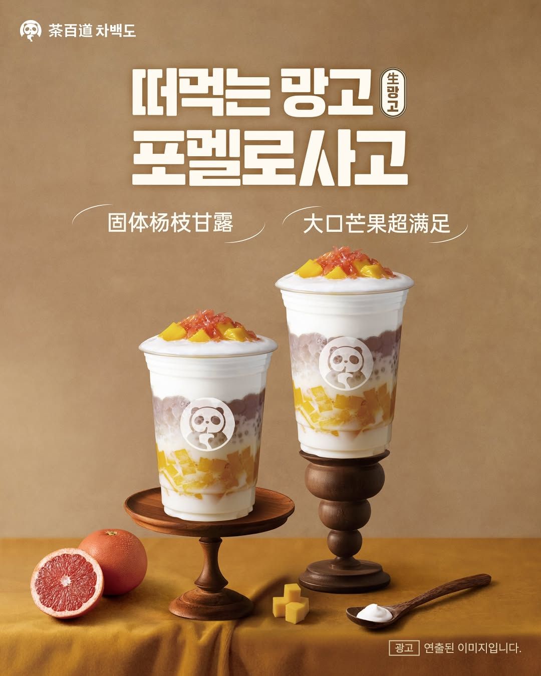 중국 기반 밀크티 브랜드 차백도는 지난 2024년 초 서울 강남 대치동에 해외 1호점을 열며 한국에 상륙했다. 지점 확장을 빠르게 하고 있는 밀크티 전문 브랜드 중 하나. 간판 메뉴 중 하나로, 중국 현지에서 메뉴가 연간 8천만 잔 이상 판매될 만큼의 폭발적 인기에 힘입어 ‘생망고 포멜로 사고’라는 이름으로 판매 중이다. 망고 과육과 자몽 알갱이가 어우러진, 진하고도 상큼한 맛을 자랑한다. 게다가 11월 20일부터는 홍대 1호점, 강남 한티점에서 신메뉴 ‘ 떠먹는 망고 포멜로 사고’를 맛볼 수 있다. 신선한 과일을 사용한다는 원칙으로 하루 한정 수량만 판매하므로 가끔은 재료 소진 시 일찍 품절될 수 있으니 주의할 것.