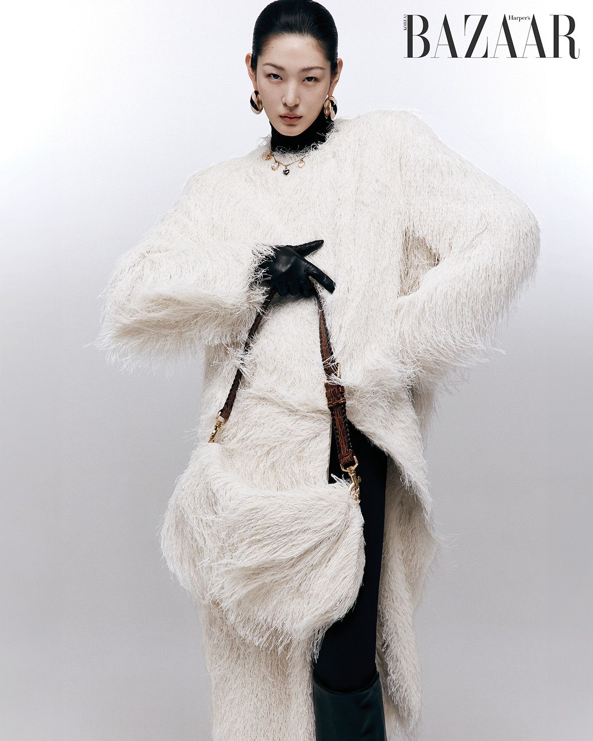 페이크 퍼 코트, 가방은 Dries Van Noten. 터틀넥은 Gabriela Hearst. 레깅스는 Chrome Hearts. 귀고리는 Self-Portrait. 목걸이는 Dolce & Gabbana. 장갑은 MaxMara. 롱 부츠는 1백70만원 Longchamp.