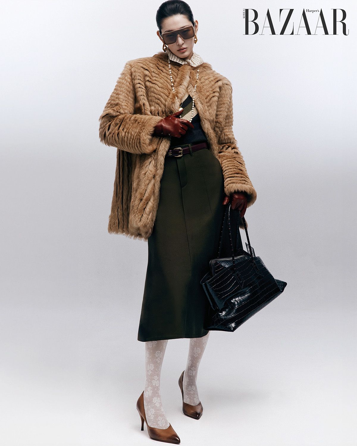 페이크 퍼 코트, 셔츠, 니트 톱, 타이츠는 모두 Valentino. 미디스커트, 벨트는 Celine. 선글라스는 MaxMara. 귀고리는 Louis Vuitton. 진주 목걸이는 Gucci. 레이어드한 목걸이는 Arket. 장갑은 Maison Margiela. 핸드백은 The Attico. 펌프스는 Miu Miu.