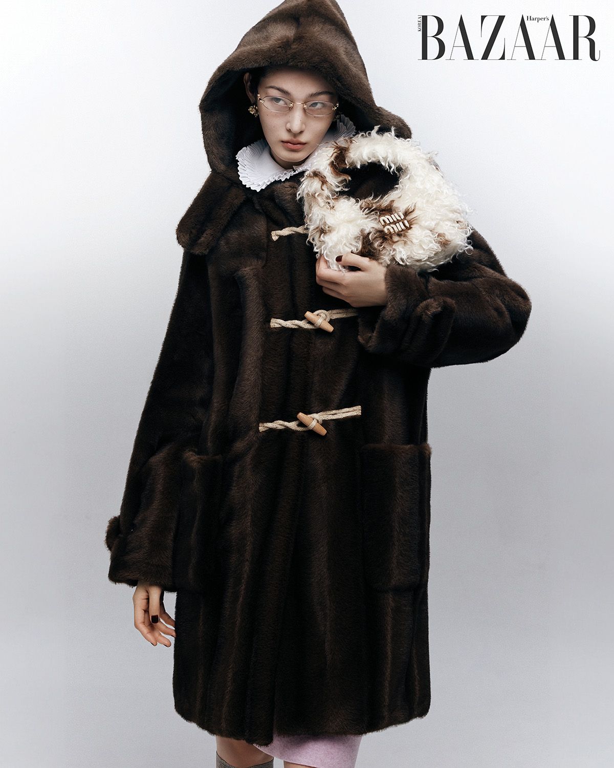 페이크 퍼 더플코트는 N°21. 블라우스는 Celine. 스커트는 Prada. 안경은 59만원대 Miu Miu by EssilorLuxottica. 귀고리, 핸드백, 니삭스는 모두 Miu Miu.