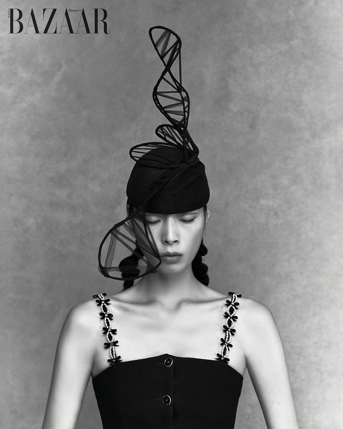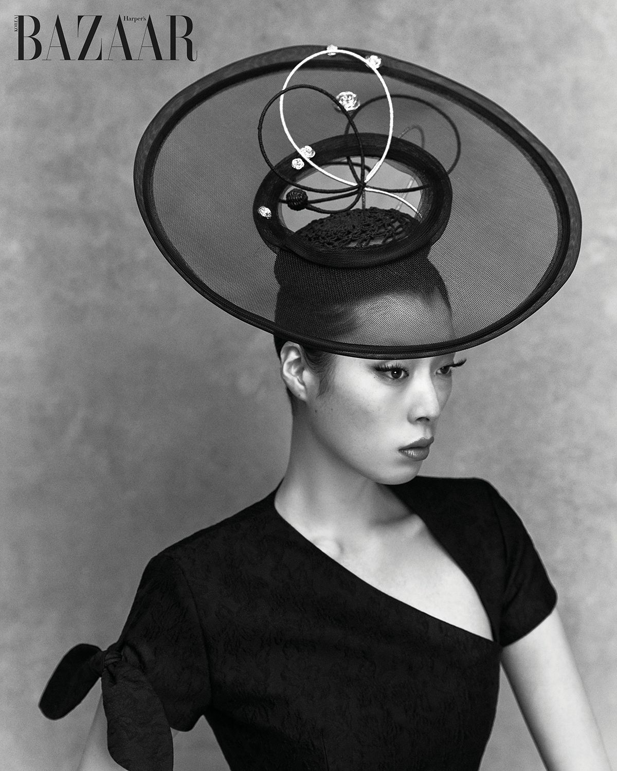 와이어 프레임에 튤을 덧댄 갓, 그 위에 얹은 베일 커버 톱햇은 Q Millinery. 언밸런스 튜브톱 드레스는 6백70만원대 Khaite.