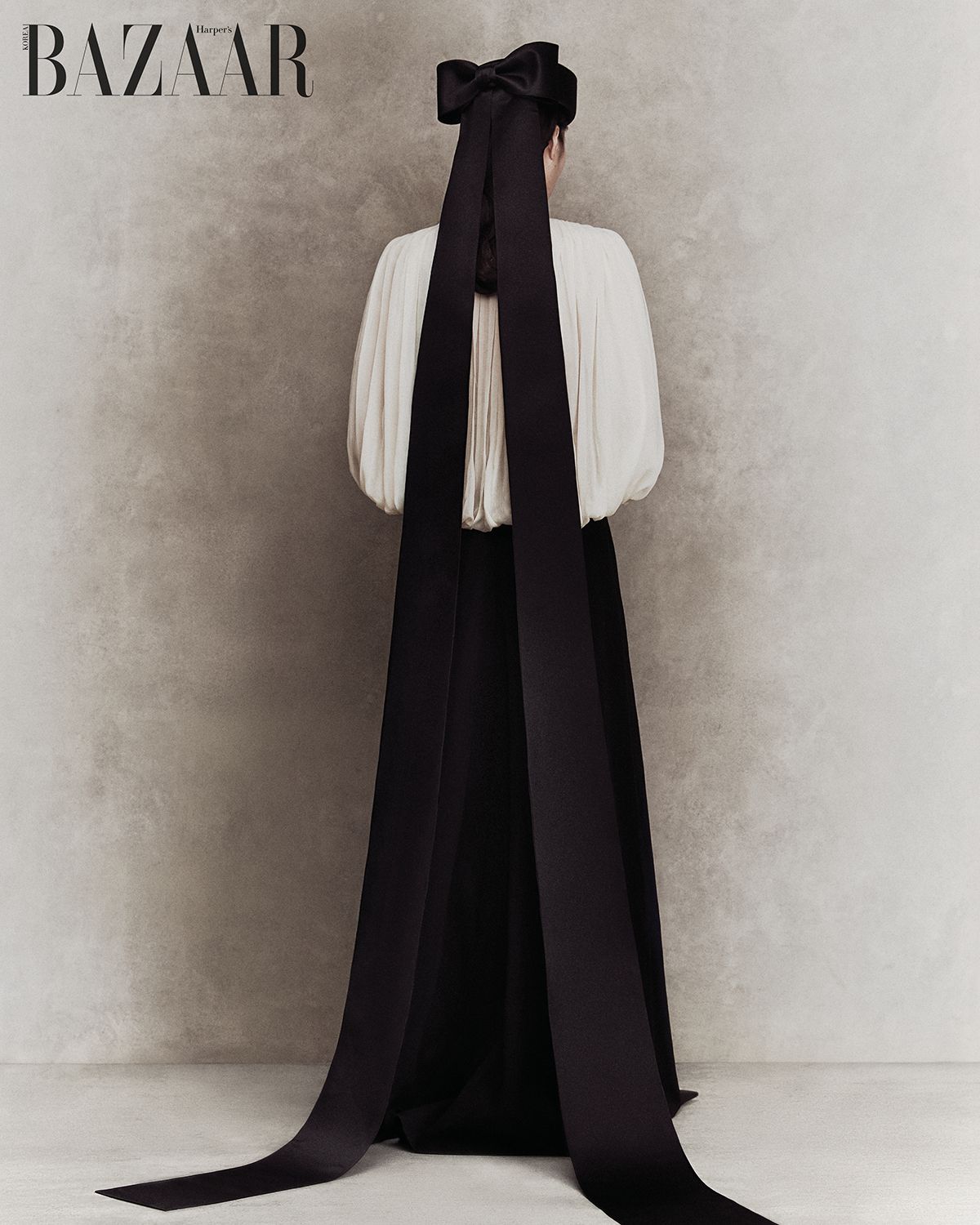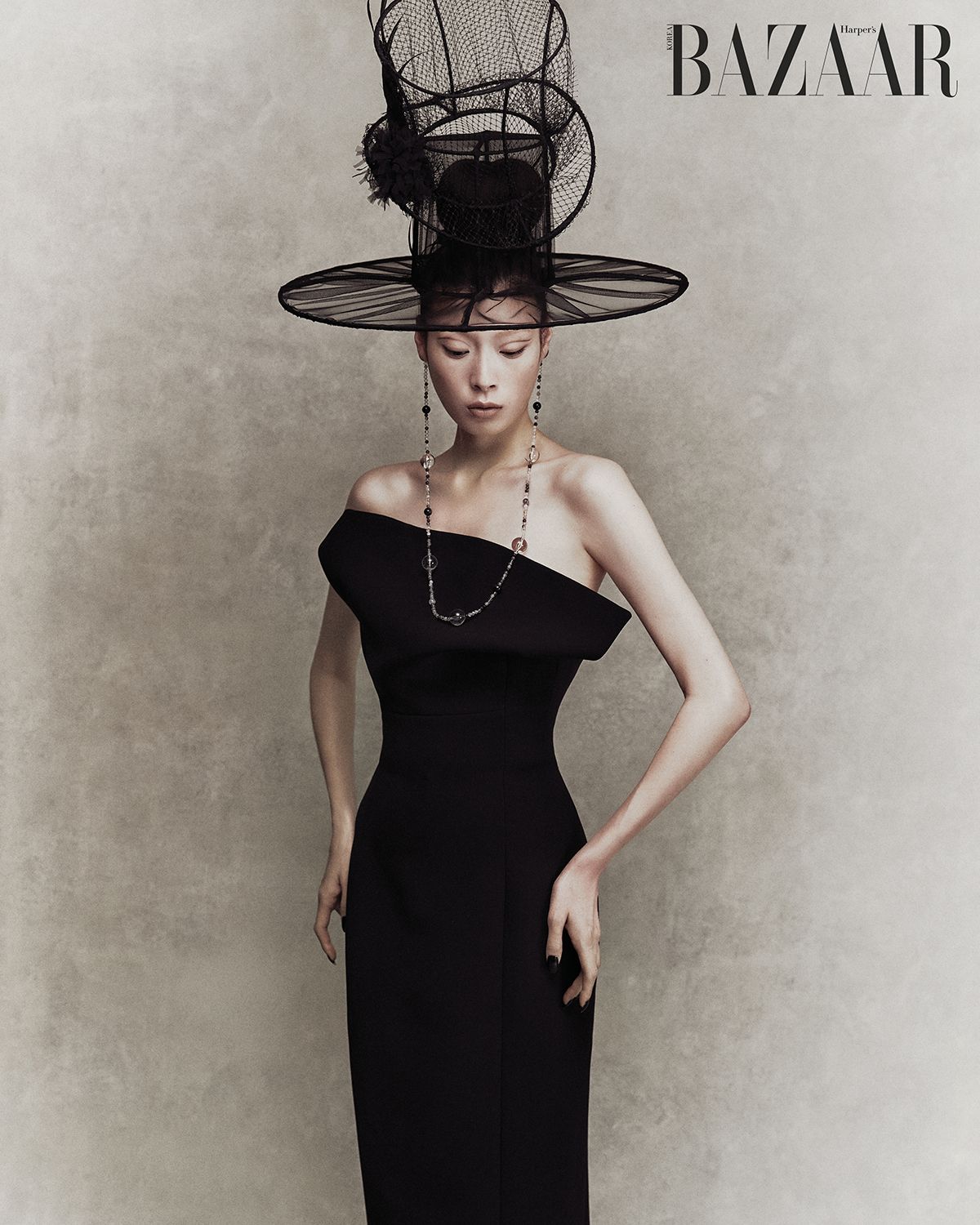 보 장식 필박스 햇은 Ōhalo. 드레스는 1천만원대 Celine. 펌프스는 Balenciaga.