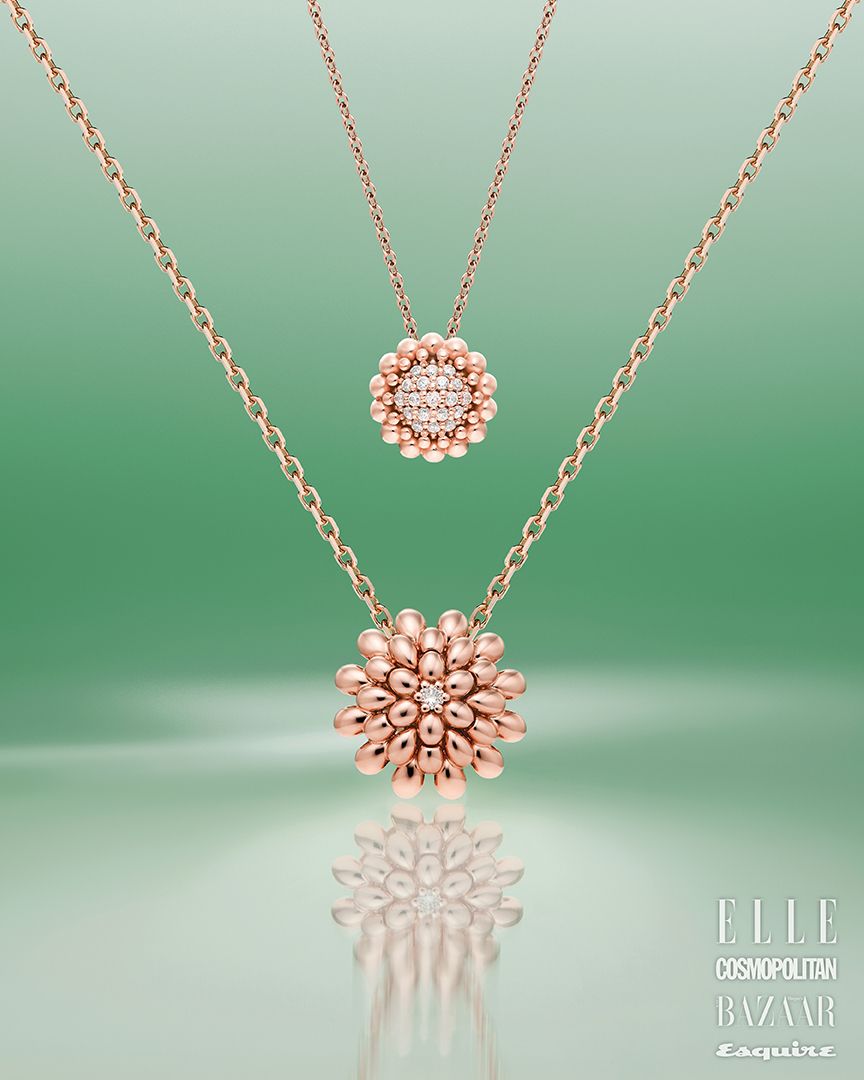 입체적인 메탈 플라워의 균형미와 우아한 형태감이 돋보이는 벨로나 랩그로운 다이아몬드 펜던트는 34만원, 겹겹이 포개진 꽃잎의 구조적 아름다움이 인상적인 핑크 골드 소재의 플리앙 다이아몬드 펜던트는 30만원, 핑크 골드 소재의 펠샤인 체인 네크리스는 각각 47만원 모두 ROSEED’OR.