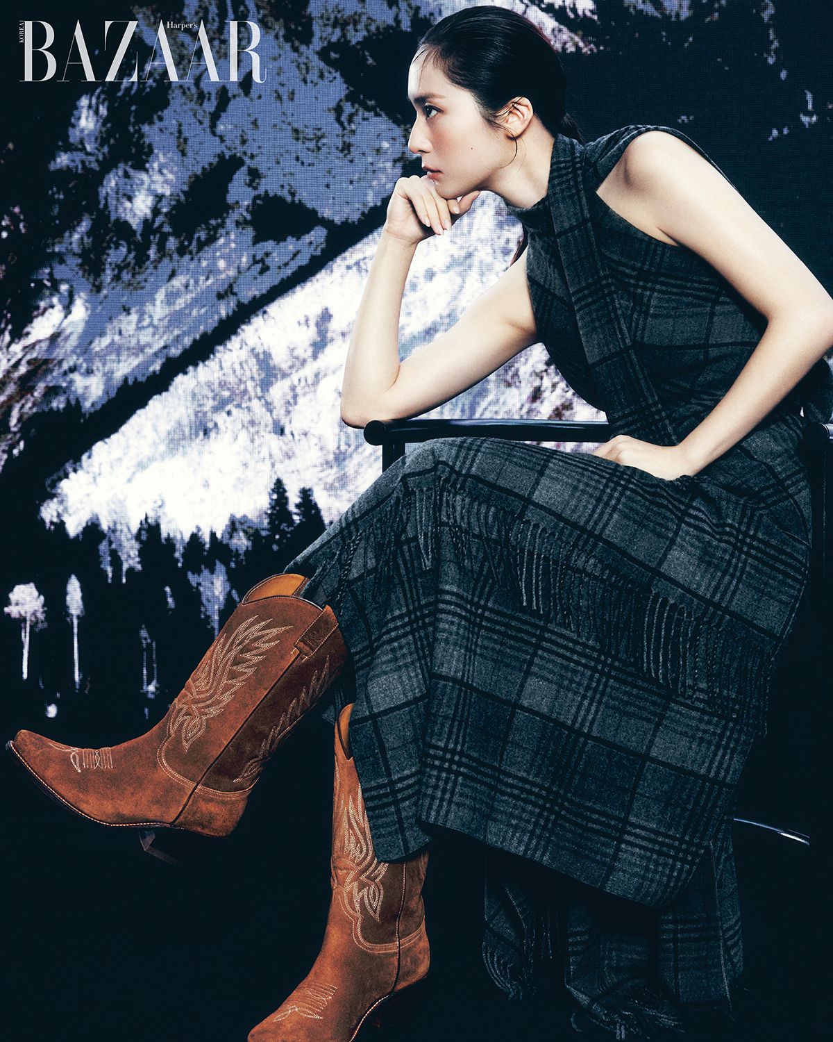 체크 패턴 톱, 스커트, 카우보이 부츠는 모두 Ralph Lauren Collection.