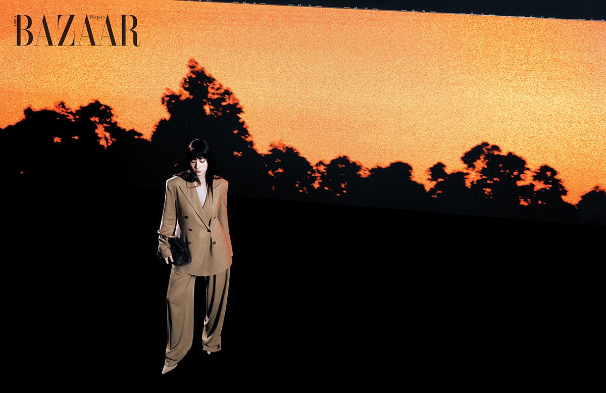 헤링본 코트, 실크 블라우스, 와일드 코르셋 벨트는 모두 Ralph Lauren Collection. 스타킹은 스타일리스트 소장품.