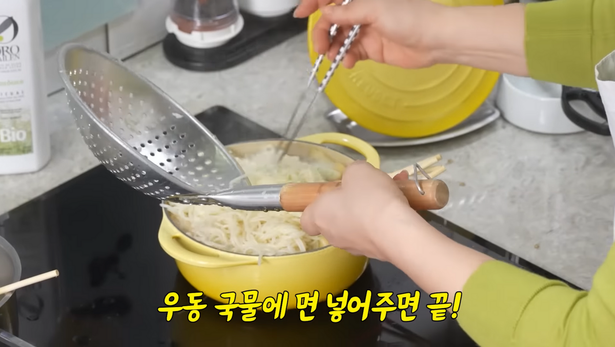 따끈한 국물이 저절로 생각나는 요즘의 계절. 최화정이 제안한 어묵 유부 우동은 어떨까? 물론 여기에도 우동사리 대신에 두부면이 들어가 칼로리 걱정은 붙들어도 괜찮겠다. 꼬치 어묵을 먼저 삶아 우동 베이스를 만들어 주는데, 이때 국물은 코인 육수와 칼칼함을 위한 청양고추, 액젓 조금 넣어주면 된다. 이렇게 끓여준 육수에 청양고추와 유부를 듬뿍 넣어 깊은 맛을 내준 후, 헹군 두부면을 넣어 한 번 더 끓이면 밀가루 없이도 충분히 포간감 있는 우동 완성. 그리고 킥은 신 김치! 없으면 깔끔한 우동, 넣으면 좀더 감칠맛 나는 맛을 만족스럽게 느낄 수 있을 것.