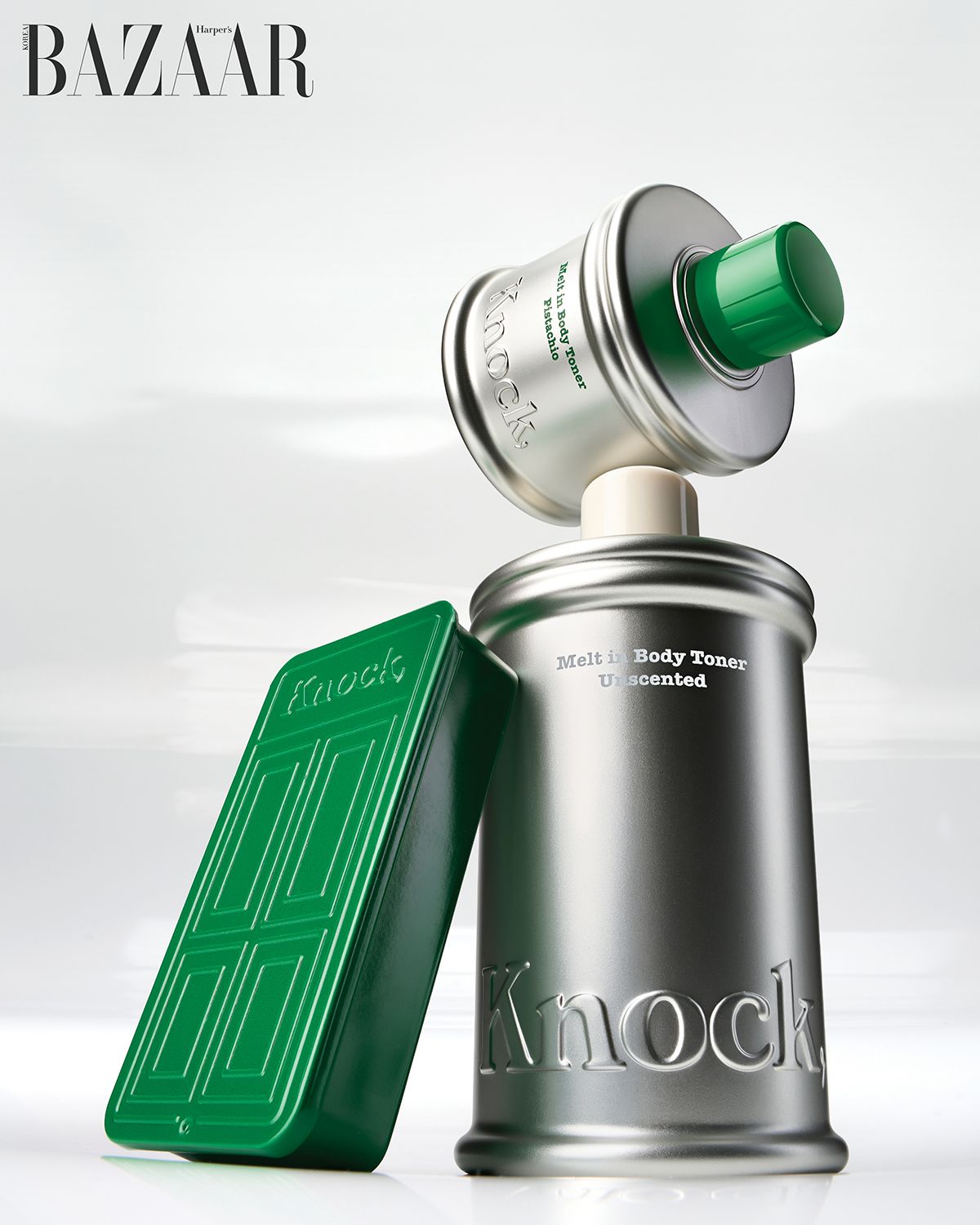 (위부터) Knock 멜트 인 바디 토너 피스타치오(미니), 멜트 인 바디 토너 언센티드, 도어 디자인 틴 케이스(구매 증정품) 질감은 밀크 토너, 보습감은 바디 로션을 능가한다. 토너를 바디 케어에 접목함으로써 경계를 허문다는 브랜드 정체성을 대변한다. 100ml 1만8천원, 300ml 3만6천원.