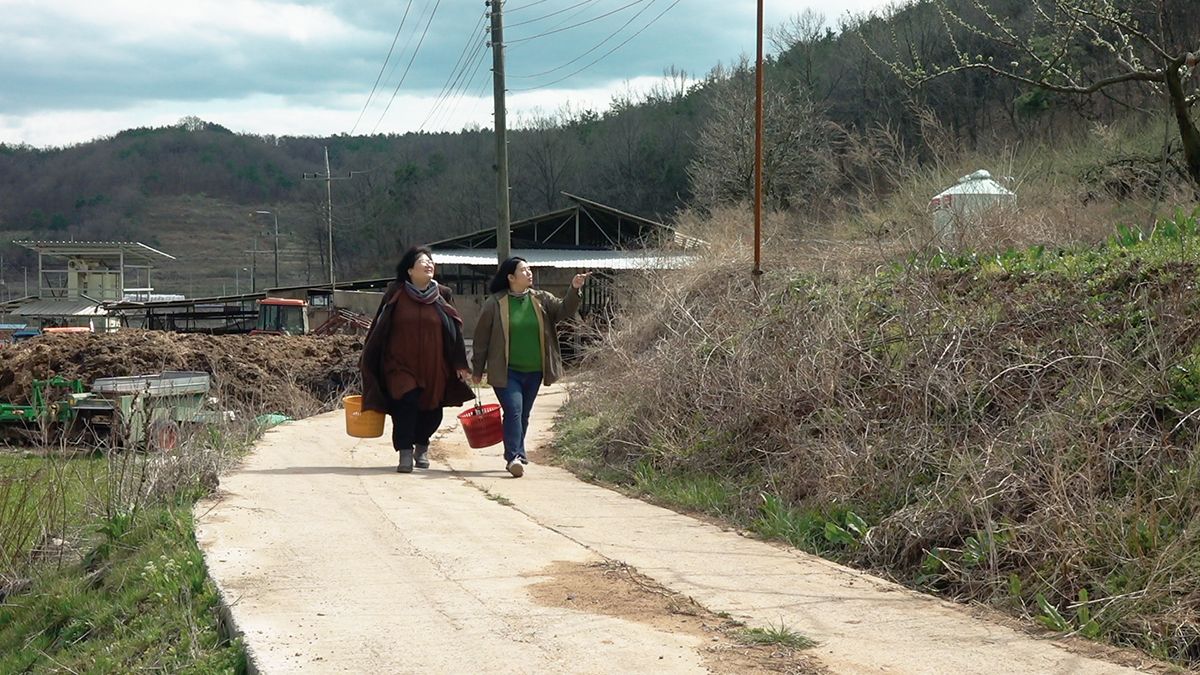 다큐멘터리 영화 <다섯 번째 방> 속 한 장면. 들꽃이 흐드러진 밭에서 모녀가 함께 냉이를 캐는 모습이다.