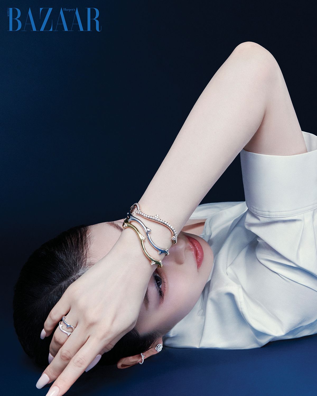 핑크 골드 ‘브아 드 로즈’ 이어커프, 화이트 골드 ‘브아 드 로즈’ 이어링, 꽃 모티프 ‘로즈 디올 바가텔’ 이어링, 옐로 골드 ‘브아 드 로즈’ 브레이슬릿, 덩굴 라인에 꽃이 포인트인 ‘로즈 디올 바가텔’ 브레이슬릿, 오른손 약지의 ‘브아 드 로즈’ 링, 오른손 검지의 ‘로즈 디올 바가텔’ 링, 왼손 중지의 ‘로즈 디올 바가텔’ 링은 모두 Dior Joaillerie.