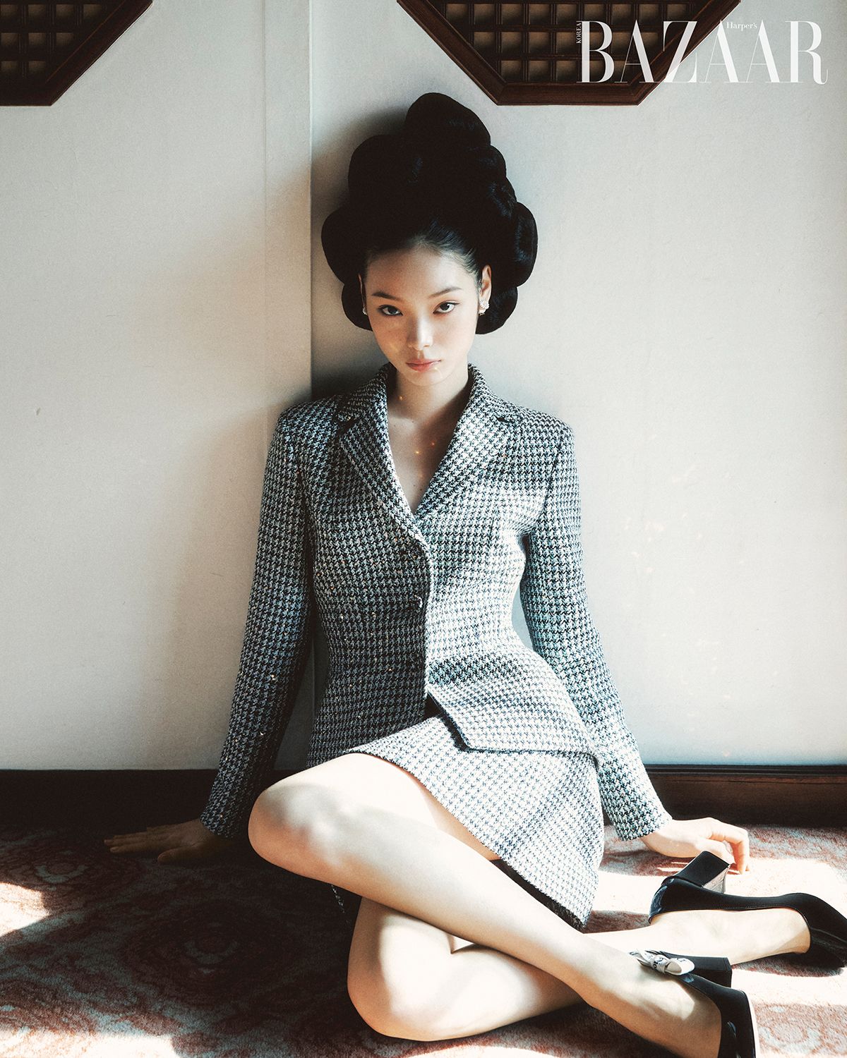 하운드투스 체크 재킷, 미니스커트, ‘트라이벌 데이지’ 귀고리, 펌프스는 모두 Dior.