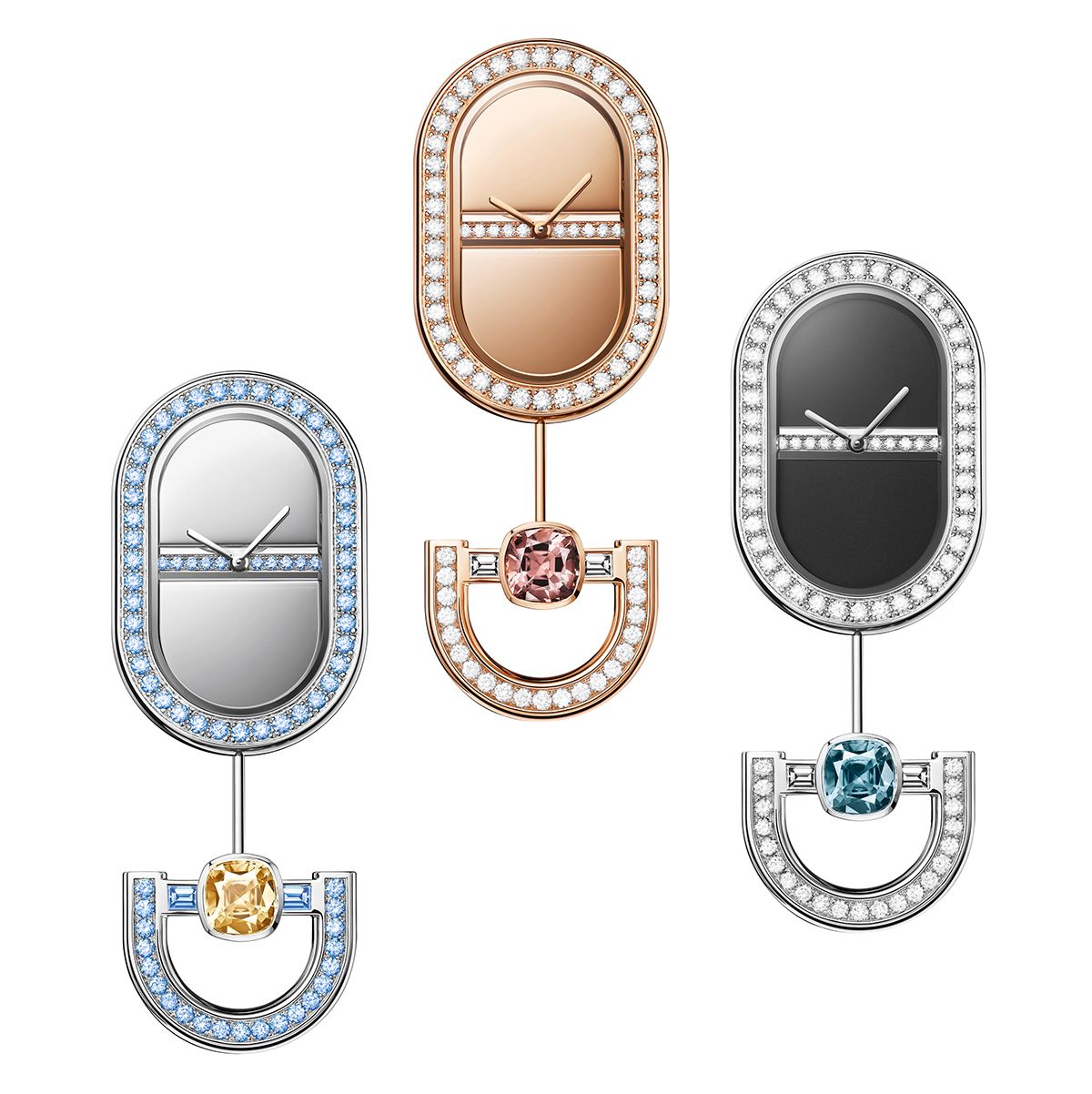로즈 골드·오닉스·화이트 골드 다이얼의 ‘메일롱 리브르’ 브로치는 모두 Hermès.
