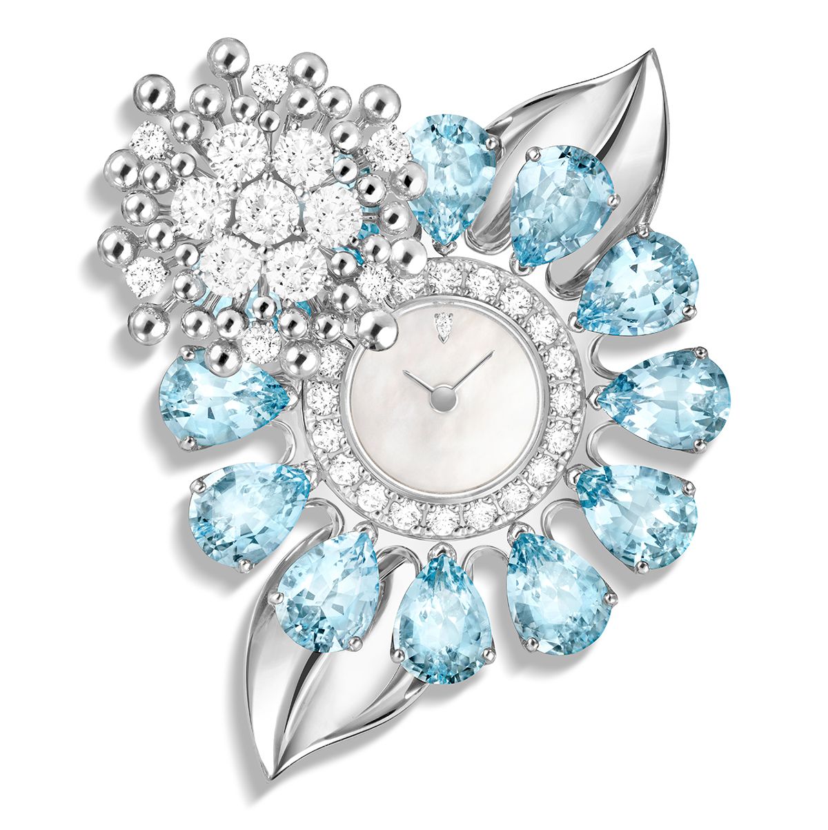 아콰마린과 다이아몬드를 세팅해 꽃을 형상화한 ‘플레르 드 하와이 시크릿’ 워치는 Van Cleef & Arpels.