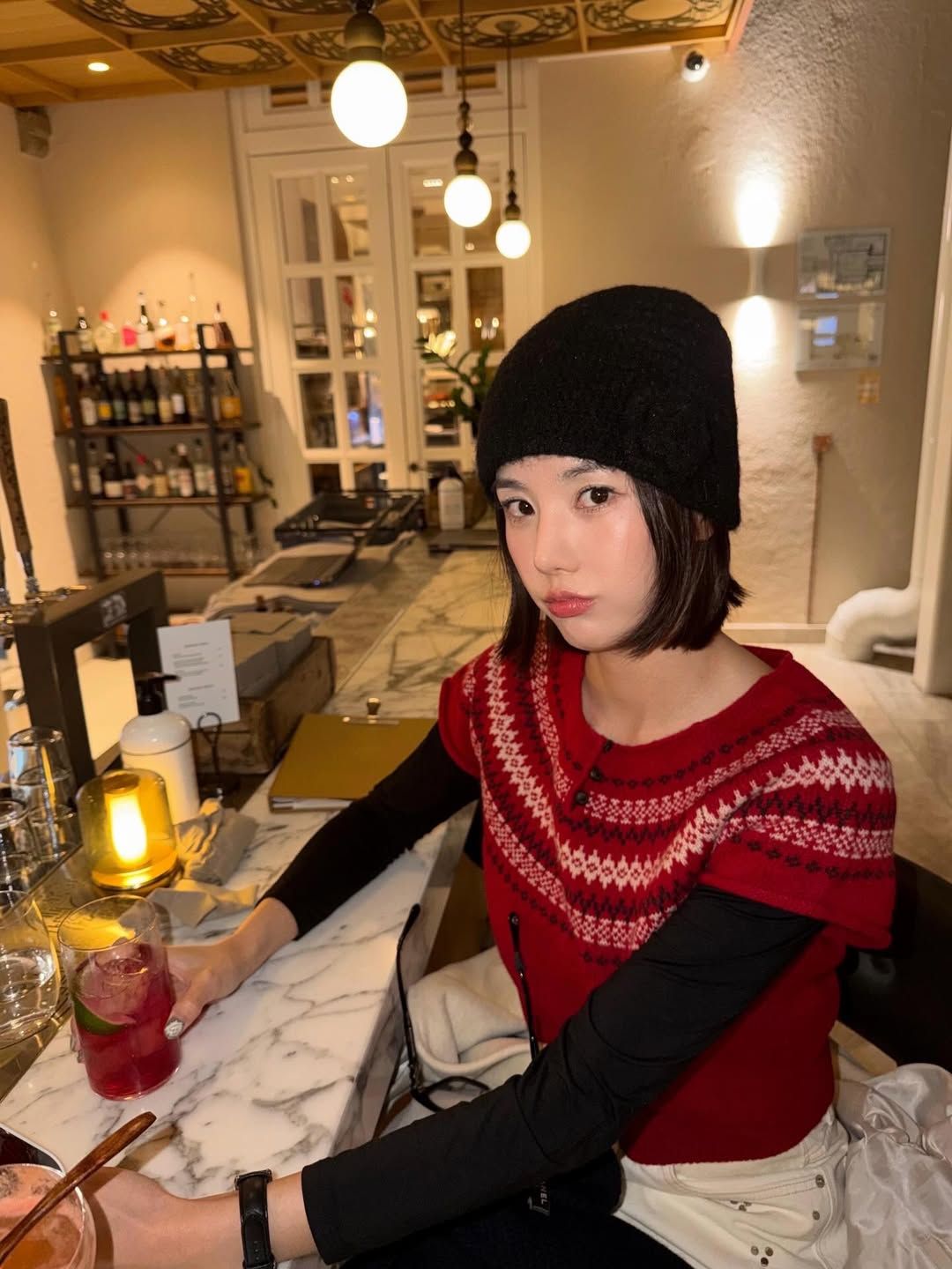 홀리데이 무드가 물씬 풍기는 레드와 블랙 컬러 조합의 룩을 선보인 권은비. 잔잔한 노르딕 패턴이 돋보이는 반팔 디자인의 니트 탑에 블랙 이너 탑과 니트 비니를 매치해 편안하면서도 멋스러운 윈터 룩을 선보였다. 홀리데이 무드는 물론 편안한 매력까지 모두 갖춘 노르딕 패션을 즐기는 법, 권은비의 데일리 룩에서 참고해 보길.
