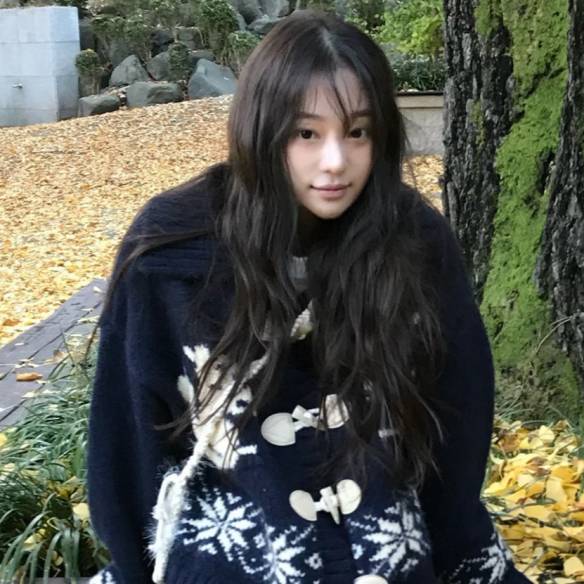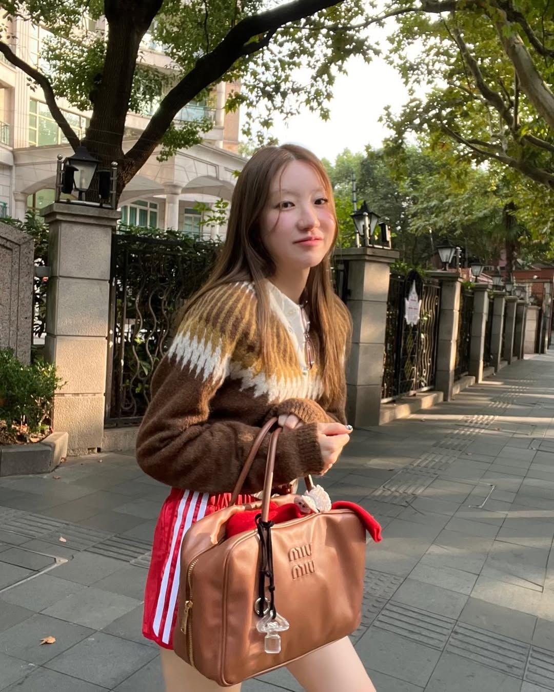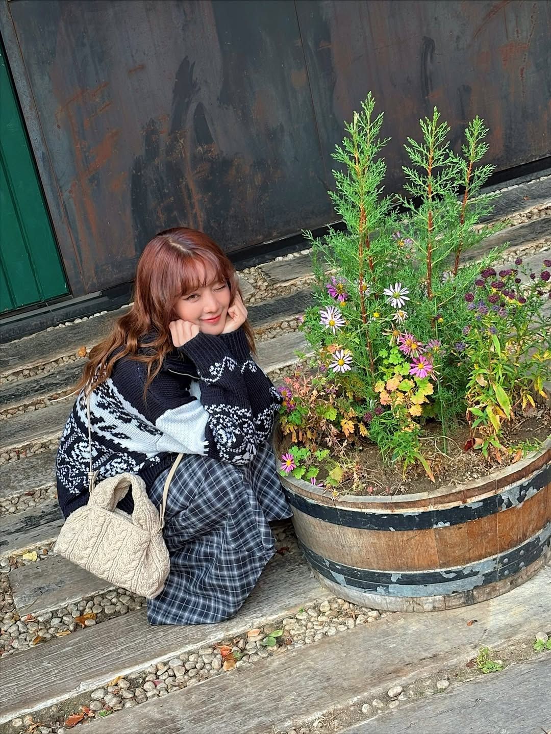 그래니 스타일의 정석이라 할 수 있는 노르딕 패턴의 두툼한 니트 아우터에 빈티지한 분위기의 체크 롱 스커트를 매치한 민니. 상의와 하의를 서로 비슷한 네이비 컬러 계열로 맞추고, 사랑스러운 포인트를 더할 수 있는 케이블 니트 소재 백을 매치했다. 올겨울 사랑스럽고 따스한 분위기를 전하는 룩을 완성하고 싶다면 민니의 니트 룩이 정답이다.