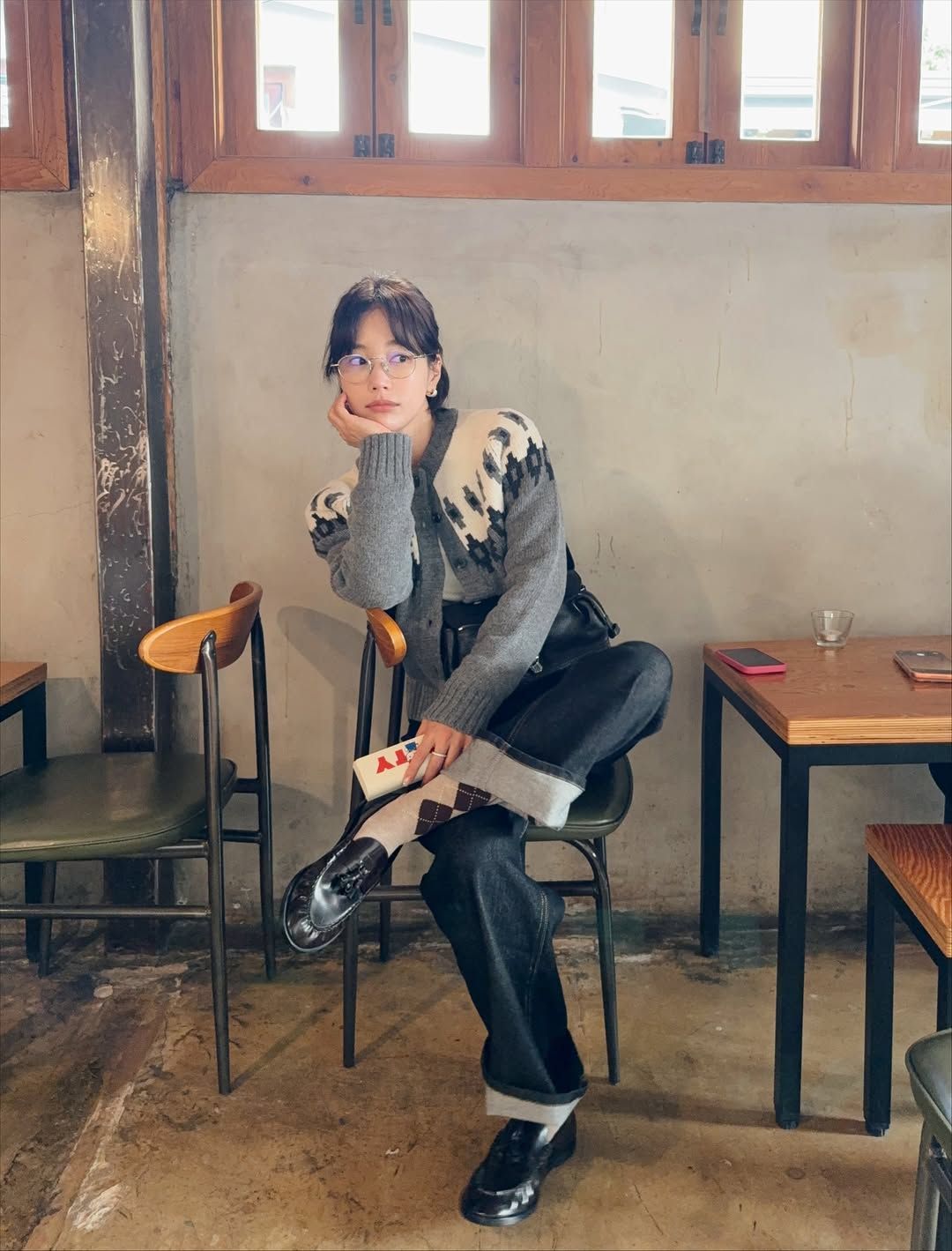 모던하면서도 기하학적인 패턴으로 거듭난 노르딕 패턴 니트 가디건을 선택한 기은세. 겨울 아우터 안에 이너로 입기 좋은 스타일링으로, 그레이 컬러의 노르딕 니트 가디건에 티셔츠와 생지 데님 팬츠를 매치했다. 여기에 아가일 패턴의 양말과 블랙 로퍼를 곁들여 전체적으로 클래식하면서도 중성적인 분위기를 전하는 데일리 룩을 완성했다.