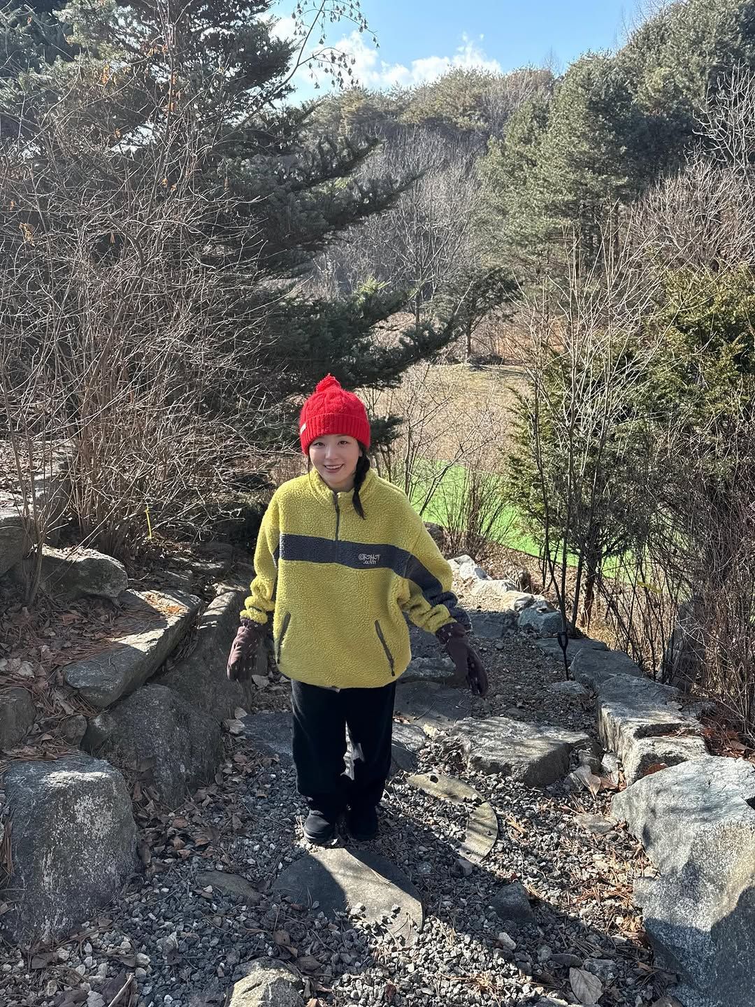 사복 장인 슬기는 연말을 기념해 가족과 함께한 듯한 등산 사진을 공개하며 일명 ‘뽀글이 패션’을 선보였다. 지나친 볼륨감 없이 따뜻한 보온성을 자랑하는 플리스 아이템을 입은 그녀는 등산 룩을 위한 활동성을 고려해 낙낙한 사이즈의 쿼터 집업 플리스를 입고 산에 올랐다. 상큼한 옐로톤의 플리스 패션을 돋보이게 한 스마트한 선택은 바로 선명한 레드 컬러의 니트 비니. 비비드한 두 컬러의 대비가 하얀 슬기의 얼굴을 더욱 사랑스럽게 비추며 겨울 등산 룩마저 상큼하게 바꿨다.
