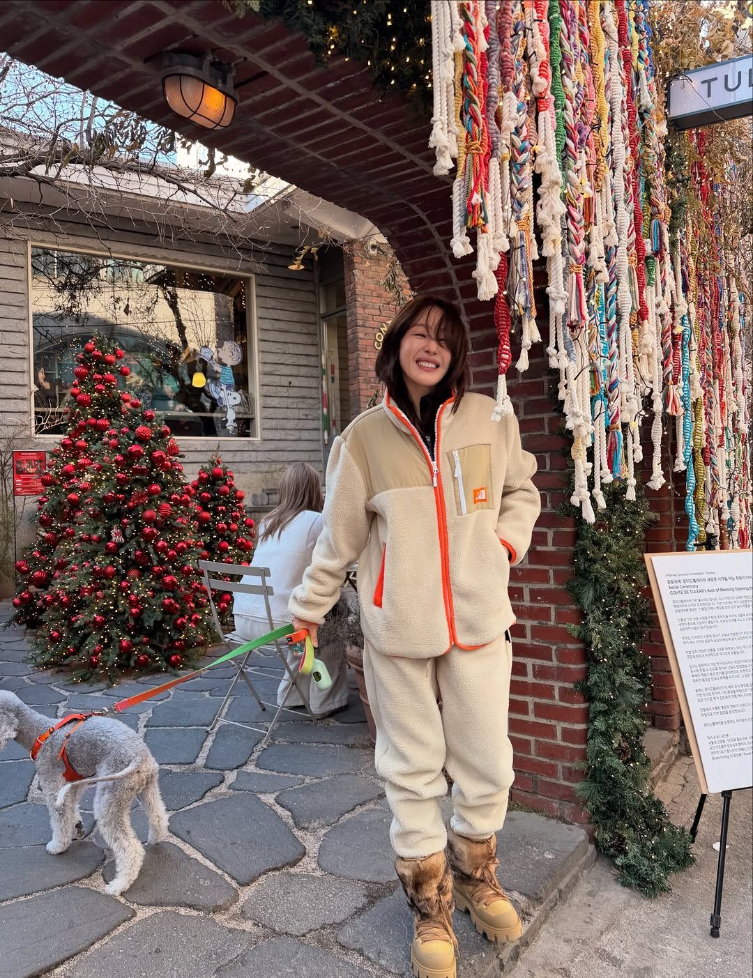 여전히 옷을 잘 입는 언니, 엄지원도 플리스 대열에 동참했다. 보기만 해도 따뜻한 아이보리 계열의 뽀글이 트레이닝 세트를 입고 강아지와 외출 나온 그녀는 두툼한 브라운 워커에 팬츠를 밀어 넣어 쿨한 윈터 룩을 완성했다. 포인트는 따뜻한 웜톤 소재의 재킷 사이로 시선을 끄는 선명한 오렌지 레드 지퍼 라인들. 한 끗 차이의 디테일로 플리스를 가장 쿨한 패션으로 바꾼 그녀의 감각을 눈여겨보자.
