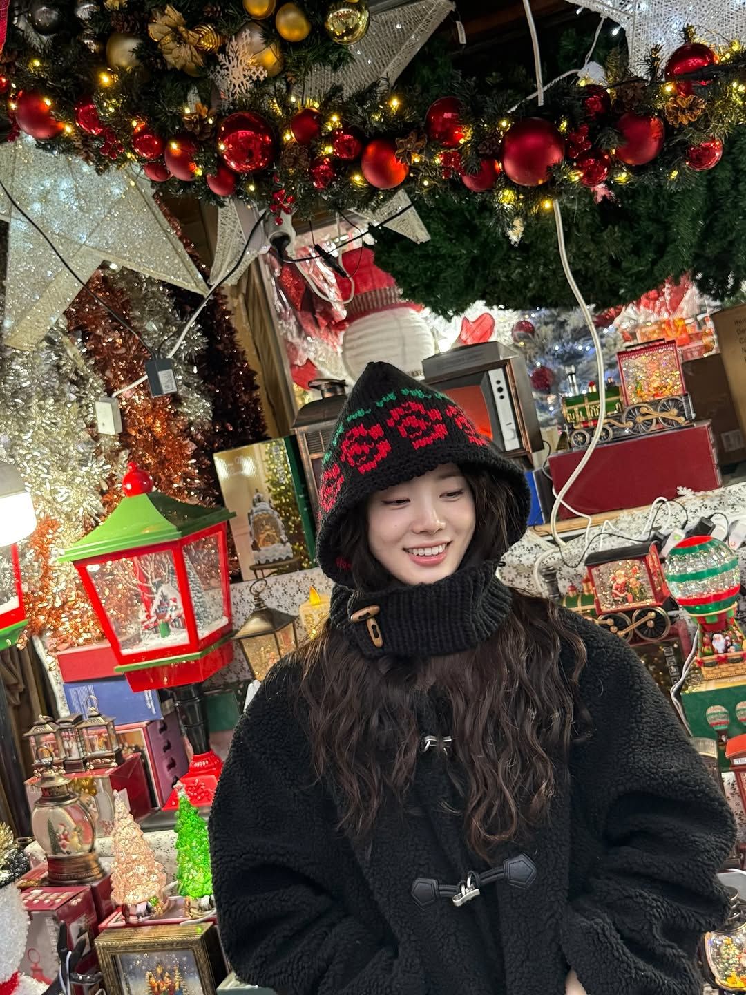 연말 시즌을 맞아 남대문 시장을 찾은 신시아. 다양한 과자와 장난감 코너에서 소녀미를 뽐낸 그녀의 아우터 역시 플리스 소재로 제작된 코트다. 새하얀 피부가 돋보이는 블랙 컬러의 플리스 ‘떡볶이 코트’를 선택한 그녀는 이에 컬러 포인트를 줄 수 있는 빨간 장미 패턴이 돋보이는 블랙 니트로 스타일을 살렸다. 학창 시절 최애 코트였던 토글 버튼에 플리스 소재를 사용한 코트를 선택해 학창시절로 돌아간 신시아의 스타일 역시 당장 위시리스트에 넣고 싶을 정도다.