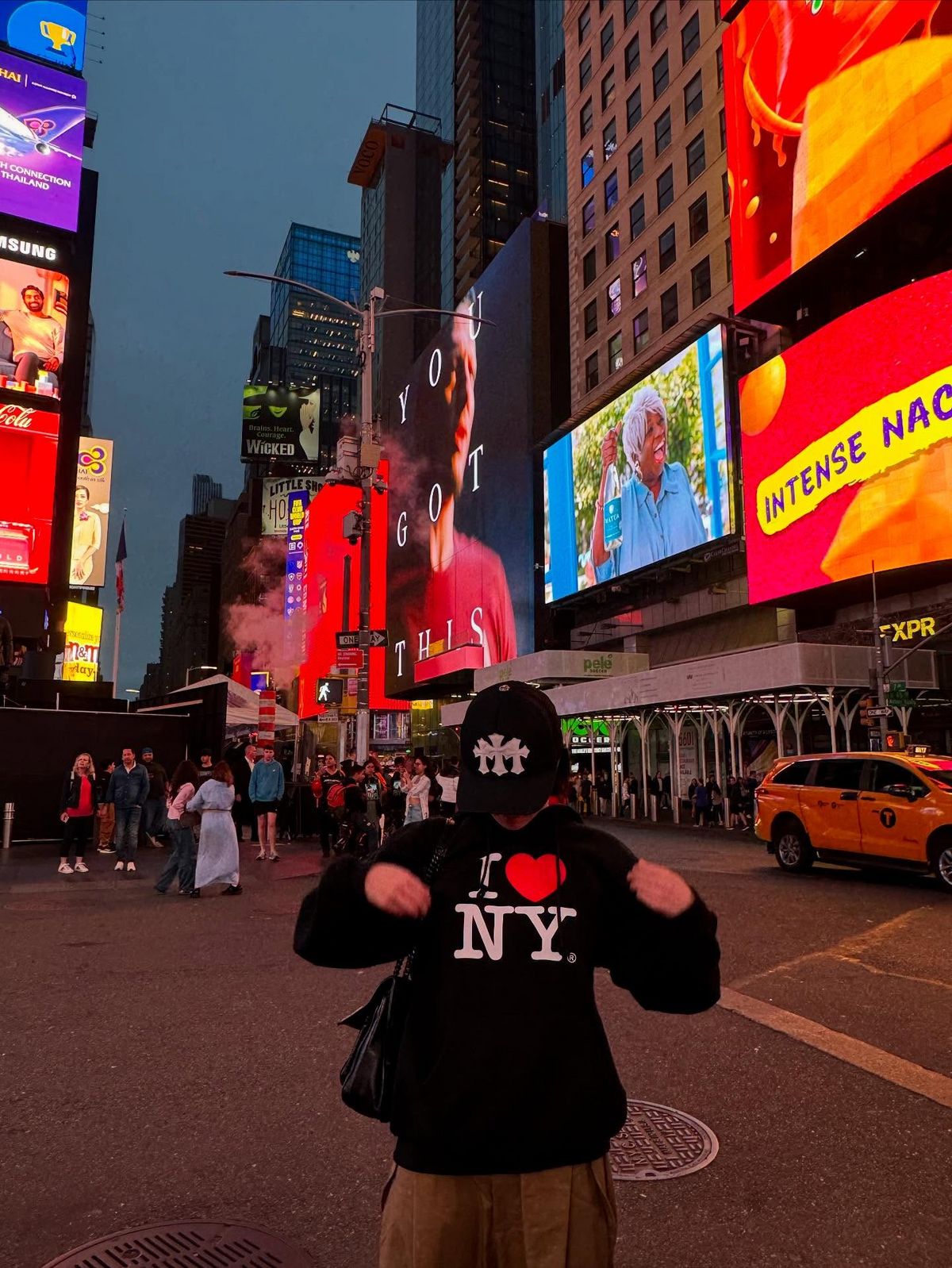 크롬하츠 트러커햇으로 뉴욕 거리와 어울리는 힙한 스트릿 무드를 완성한 조유리. 블랙 캡에 더해진 화이트 패치가 후디의 아이러브뉴욕 레터링과 이어지듯 연출한 위트있는 룩!