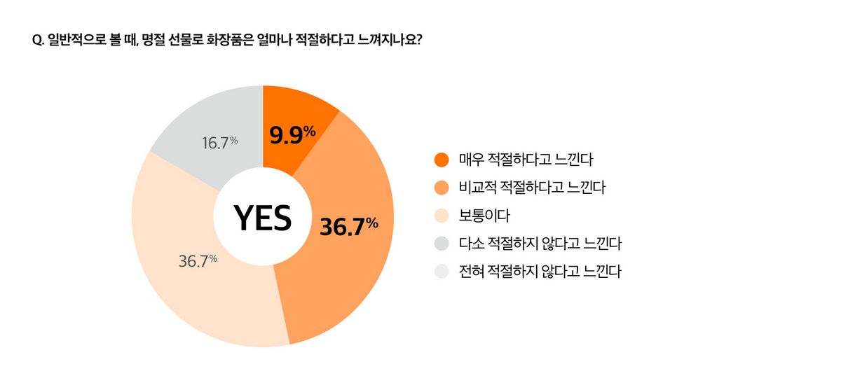 - 설문 결과, 화장품은 실용성과 활용도를 갖춘 카테고리로 인식되며 명절 선물의 새로운 대안으로 주목받고 있다.