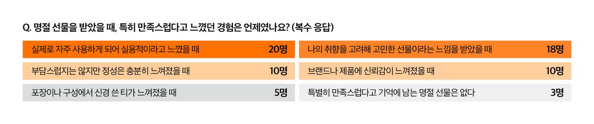기억에 남는 명절 선물에 대한 질문에는 실제로 자주 손이 가는, 실용성이 좋은 선물을 꼽은 응답(20명)이 가장 많았다. 받는 사람의 취향을 고려해 고른 선물일수록 만족으로 이어진다(18명)는 반응도 뒤따랐다. 반면, 보관이 번거롭거나 결국 사용 되지 않는 선물은 아쉬운 기억(16명)으로 남았다. 명절 선물의 가치는 첫인상에서 시작되지만, 결국 일상 속에서 얼마나 자연스럽게 쓰이느냐에 따라 완성된다.