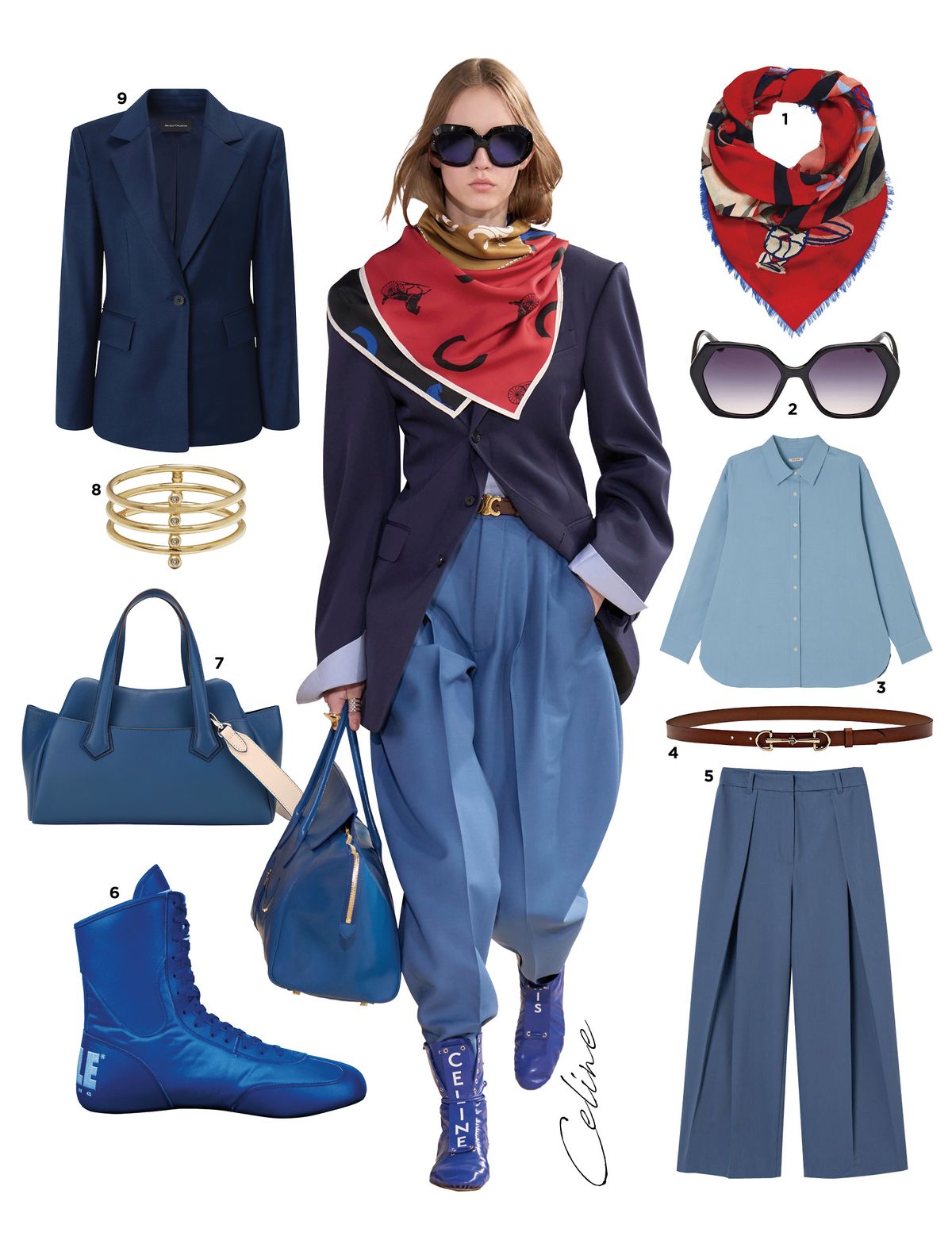 1 스카프는 28만원대 Vivienne Westwood. 2 선글라스는 15만원대 Guess. 3 셔츠는 13만원대 Àvie Muah. 4 벨트는 8만원대 Massimo Dutti. 5 팬츠는 5만원대 8 Seconds. 6 하이톱 스니커즈는 19만원대 Title. 7 톱 핸들 백은 38만원대 Thavma. 8 반지는 89만원 Coldframe. 9 재킷은 75만원대 Izzat Collection.