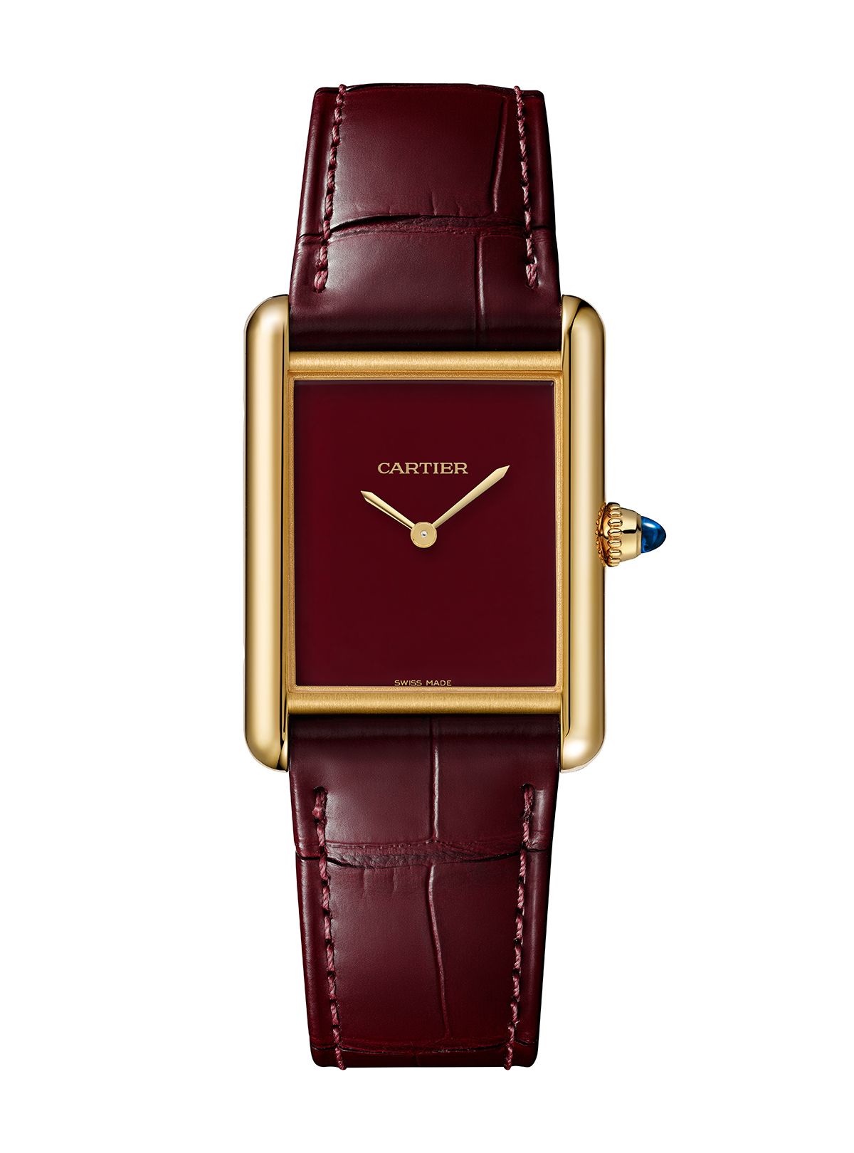 레드 래커 처리한 다이얼과 버건디 가죽 스트랩이 조화로운 ‘탱크 루이 까르띠에’ 워치는 Cartier.