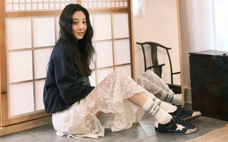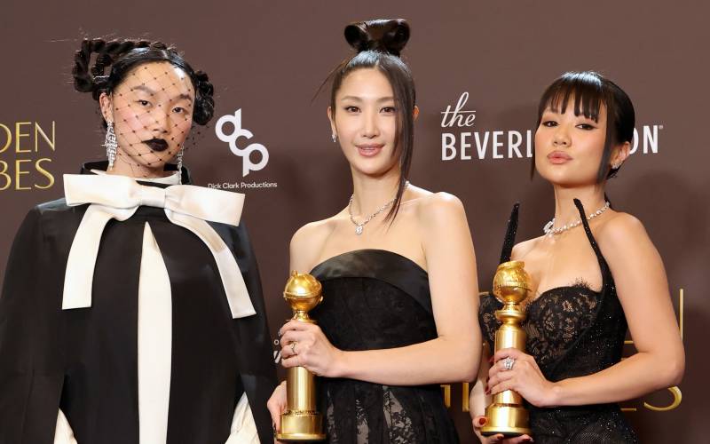 ‘케이팝 데몬 헌터스’ OST <GOLDEN>으로 ‘베스트 송 리튼 포 비주얼 미디어’를 수상한 이재는 르쥬의 SS26 컬렉션 룩으로 레드카펫에 올랐다. 전통 공예를 현대적으로 풀어낸 스팽글 스커트는 등장만으로도 강한 인상을 남긴다. 50년 경력의 금박공이 작업한 2,500여 개의 ‘복(福)’ 모티프 스팽글이 스커트를 채우고, 그 사이로 깃털이 스며든 듯한 디테일이 동양적인 선의 미감을 강조한다. 화려한 스커트와 대비되는 절제된 톱은 전체 균형을 잡는 아이템. 한복 고름에서 영감을 받은 듯한 실루엣과 은은한 비단 광택, 길게 늘어진 고름 디테일이 상·하의를 자연스럽게 연결한다. ‘케이팝 데몬 헌터스’와 마찬가지로, 이재의 레드 카펫 룩에도 한국적 정서가 자연스럽게 배어 있다.