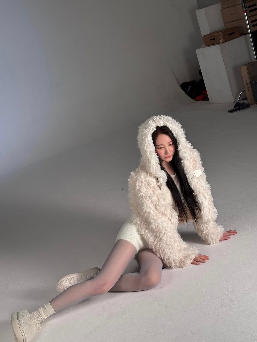 아이돌다운 발랄함과 소녀의 상큼함을 동시에 담아낸 스타일링을 선보인 이채연이 선택한 크림 톤의 후드 형 뽀글이 퍼 아우터 스타일링도 참고하자. 후드가 달린 크롭 기장의 뽀글이 퍼 아우터를 선택한 그녀는 쇼츠를 매치해 볼륨감을 상의에 집중시켜 전체 실루엣은 가볍게 정리하고 다리는 더욱 길어 보이게 연출했다. 포근함에 키치한 감도를 더하고 싶다면, 이채연이 한 것처럼 단순한 이너와 후드 형 퍼의 조합으로 질감 대비를 살리는 연출이 효과적이다.