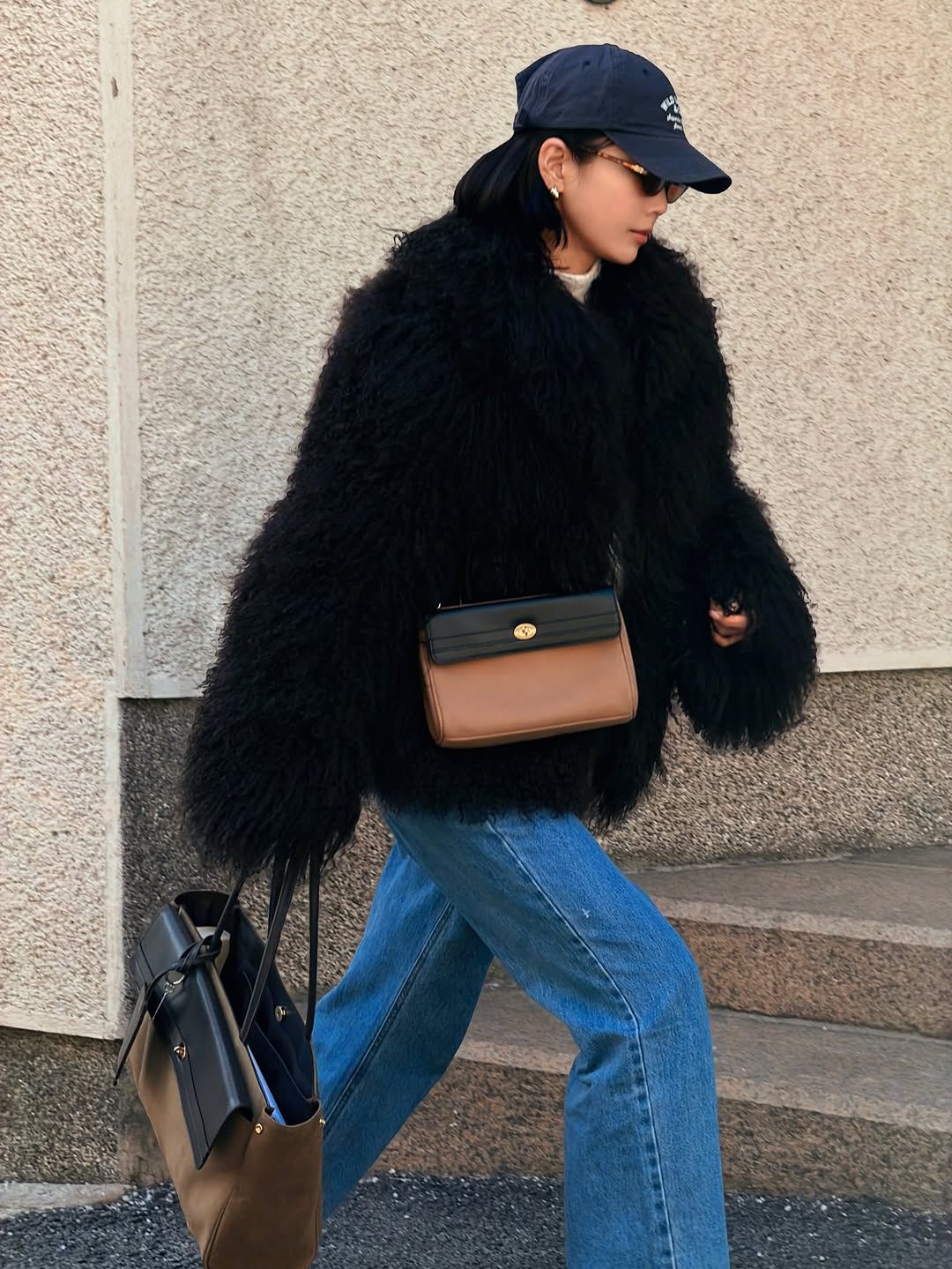 기은세 역시 ‘뽀글이 퍼’ 아우터 대열에 합류했다. 뽀글이 퍼를 잘 소화한 다른 셀럽들과 다르지 않은 기은세만의 비결은 바로 과하지 않은 감각과 완성도. 풍성한 실루엣의 짙은 브라운 퍼 아우터에 데님과 볼 캡을 더해 힘을 뺀 캐주얼 무드를 만든 것은 디테일의 힘을 아는 영리한 스타일링. 백 컬러 역시 브라운 계열에서 선택하여 부피감이 큰 퍼 아우터를 선택했음에도 전체 컬러 톤을 절제해 웨어러블한 균형을 유지했다.