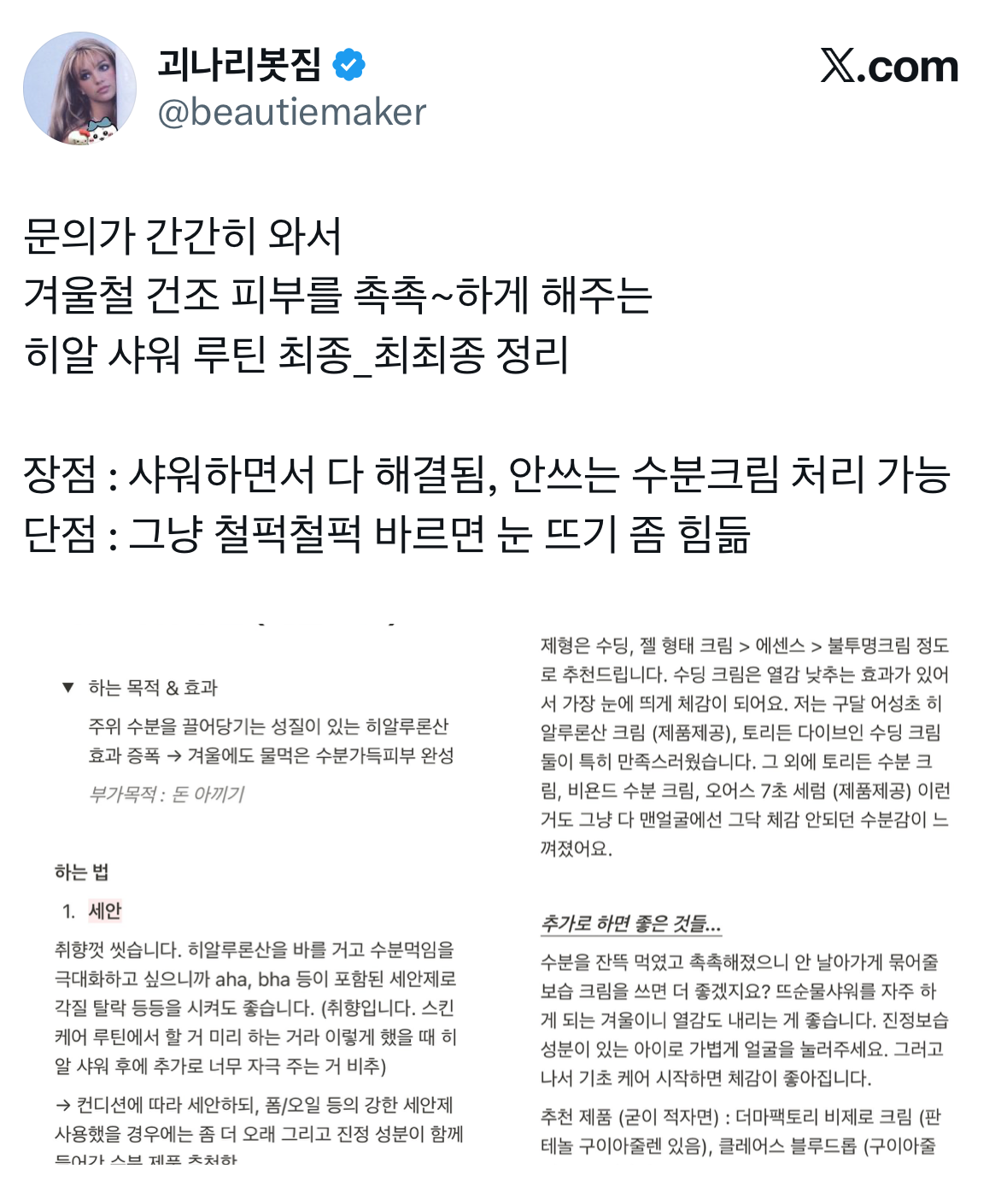 X에서 난리 난 수분 폭탄 ‘히얄샤워’. 트위터(x.com)에서 활동하는 유저 ‘괴나리봇짐’이 루틴을 공개하며 확산이 됐다. 샤워 시 열기 때문에 피부 속 수분이 더 쉽게 날아간다는 점에 착안해, 히알루론산의 성질을 활용한 아이디어다. 주변의 수분을 끌어당겨 붙잡는, 즉 자석 같은 효과를 가진 히알루론산을 미리 발라두면 수분 손실을 줄일 수 있다는 경험에서 나온 접근이었을 것. 보통 샤워 후 보습을 하는 기존 방식과 달리, 그전에 세안 및 기초 수분 제품을 먼저 바른다는 점이 포인트. 반짝하고 사라질 게 유행이라 보기 어려운 점이, 작년 11월부터 시작해 현재까지도 추천템을 공유하기도 하고 매일 같이 꽤 많은 간증 후기가 쏟아지고 있다. 샤워 이후 기초를 바르기 전까지의 공백 동안 건조함이 느껴지지 않고, 이거 하려고 샤워한다는 극찬도 여럿 보이는 중.